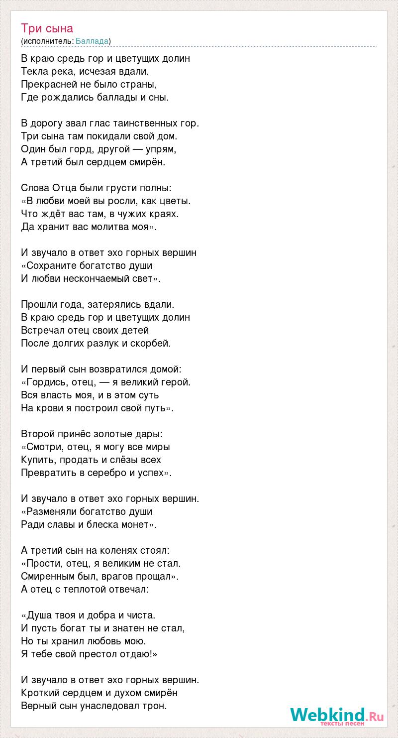 В краю средь гор и цветущих долин Текла река, исчезая вдали. Прекрасней не было страны, Где рождались баллады и сны. В дорогу звал глас таинственных гор. Три сына там покидали свой дом. Один был горд, другой — упрям, А третий был сердцем смирён. Слова Отца были грусти полны: «В любви моей вы росли, как цветы. Что ждёт вас там, в чужих краях. Да хранит вас молитва моя». И звучало в ответ эхо горных вершин «Сохраните богатство души И любви нескончаемый свет». Прошли года, затерялись вдали. В краю средь гор и цветущих долин Встречал отец своих детей После долгих разлук и скорбей. И первый сын возвратился домой: «Гордись, отец, — я великий герой. Вся власть моя, и в этом суть На крови я построил свой путь». Второй принёс золотые дары: «Смотри, отец, я могу все миры Купить, продать и слёзы всех Превратить в серебро и успех». И звучало в ответ эхо горных вершин. «Разменяли богатство души Ради славы и блеска монет». А третий сын на коленях стоял: «Прости, отец, я великим не стал. Смиренным был, врагов прощал». А отец с теплотой отвечал: «Душа твоя и добра и чиста. И пусть богат ты и знатен не стал, Но ты хранил любовь мою. Я тебе свой престол отдаю!» И звучало в ответ эхо горных вершин. Кроткий сердцем и духом смирён Верный сын унаследовал трон.