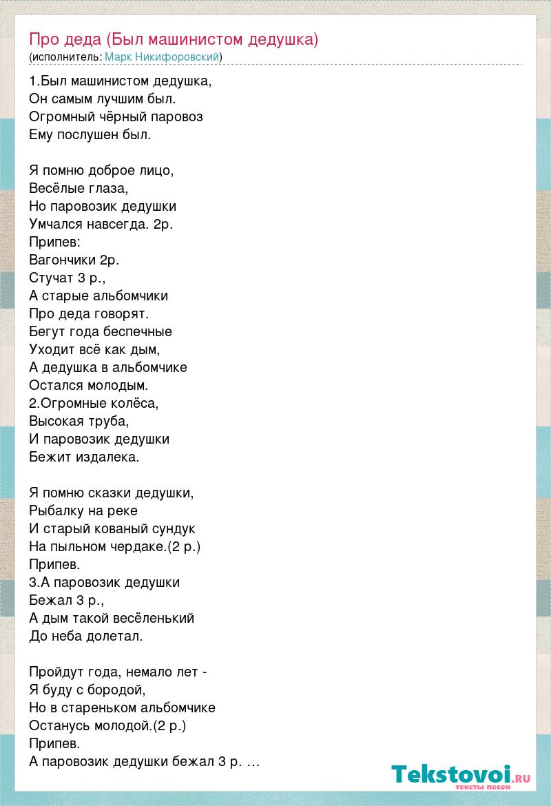 1.Был машинистом дедушка, Он самым лучшим был. Огромный чёрный паровоз Ему послушен был. Я помню доброе лицо, Весёлые глаза, Но паровозик дедушки Умчался навсегда. 2р. Припев: Вагончики 2р. Стучат 3 р., А старые альбомчики Про деда говорят. Бегут года беспечные Уходит всё как дым, А дедушка в альбомчике Остался молодым. 2.Огромные колёса, Высокая труба, И паровозик дедушки Бежит издалека. Я помню сказки дедушки, Рыбалку на реке И старый кованый сундук На пыльном чердаке.(2 р.) Припев. 3.А паровозик дедушки Бежал 3 р., А дым такой весёленький До неба долетал. Пройдут года, немало лет - Я буду с бородой, Но в стареньком альбомчике Останусь молодой.(2 р.) Припев. А паровозик дедушки бежал 3 р. …