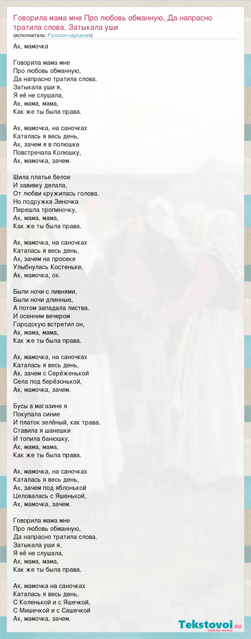 Ах, мамочка Говорила мама мне Про любовь обманную, Да напрасно тратила слова. Затыкала уши я, Я её не слушала, Ах, мама, мама, Как же ты была права. Ах, мамочка, на саночках Каталась я весь день, Ах, зачем я в полюшке Повстречала Колюшку, Ах, мамочка, зачем. Шила платье белое И завивку делала, От любви кружилась голова. Hо подружка Зиночка Перешла тропиночку, Ах, мама, мама, Как же ты была права. Ах, мамочка, на саночках Каталась я весь день, Ах, зачем на просеке Улыбнулась Костеньке, Ах, мамочка, ох. Были ночи с ливнями, Были ночи длинные, А потом западала листва. И осенним вечером Городскую встретил он, Ах, мама, мама, Как же ты была права. Ах, мамочка, на саночках Каталась я весь день, Ах, зачем с Серёженькой Села под берёзонькой, Ах, мамочка, зачем. Бусы в магазине я Покупала синие И платок зелёный, как трава. Ставила я шанешки И топила банюшку, Ах, мама, мама, Как же ты была права. Ах, мамочка, на саночках Каталась я весь день, Ах, зачем под яблонькой Целовалась с Яшенькой, Ах, мамочка, зачем. Говорила мама мне Про любовь обманную, Да напрасно тратила слова. Затыкала уши я, Я её не слушала, Ах, мама, мама, Как же ты была права. Ах, мамочка на саночках Каталась я весь день, С Коленькой и с Яшечкой, С Мишечкой и с Сашечкой Ах, мамочка, зачем.