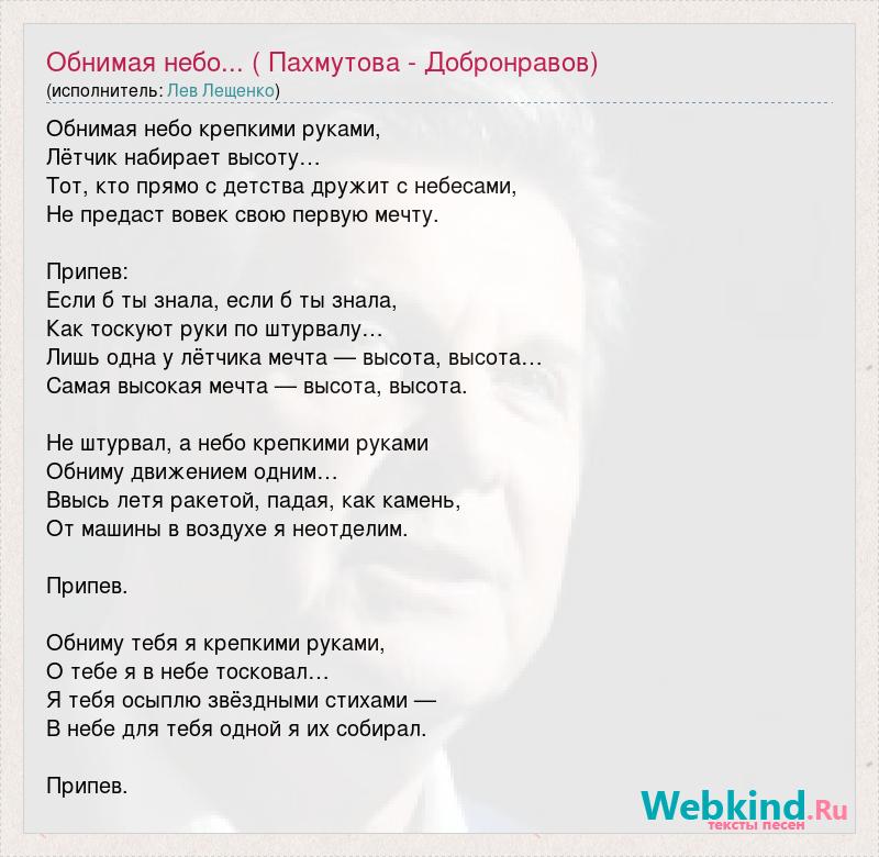 Обнимая небо крепкими руками, Лётчик набирает высоту… Тот, кто прямо с детства дружит с небесами, Не предаст вовек свою первую мечту. Припев: Если б ты знала, если б ты знала, Как тоскуют руки по штурвалу… Лишь одна у лётчика мечта — высота, высота… Самая высокая мечта — высота, высота. Не штурвал, а небо крепкими руками Обниму движением одним… Ввысь летя ракетой, падая, как камень, От машины в воздухе я неотделим. Припев. Обниму тебя я крепкими руками, О тебе я в небе тосковал… Я тебя осыплю звёздными стихами — В небе для тебя одной я их собирал. Припев.