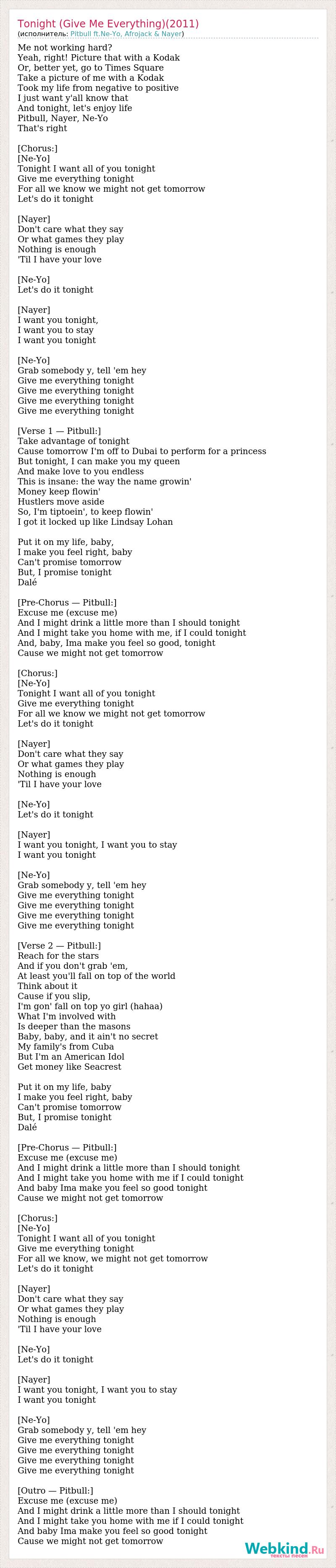 Me not working hard? Yeah, right! Picture that with a Kodak Or, better yet, go to Times Square Take a picture of me with a Kodak Took my life from negative to positive I just want y'all know that And tonight, let's enjoy life Pitbull, Nayer, Ne-Yo That's right [Chorus:] [Ne-Yo] Tonight I want all of you tonight Give me everything tonight For all we know we might not get tomorrow Let's do it tonight [Nayer] Don't care what they say Or what games they play Nothing is enough 'Til I have your love [Ne-Yo] Let's do it tonight [Nayer] I want you tonight, I want you to stay I want you tonight [Ne-Yo] Grab somebody y, tell 'em hey Give me everything tonight Give me everything tonight Give me everything tonight Give me everything tonight [Verse 1 — Pitbull:] Take advantage of tonight Cause tomorrow I'm off to Dubai to perform for a princess But tonight, I can make you my queen And make love to you endless This is insane: the way the name growin' Money keep flowin' Hustlers move aside So, I'm tiptoein', to keep flowin' I got it locked up like Lindsay Lohan Put it on my life, baby, I make you feel right, baby Can't promise tomorrow But, I promise tonight Dalé [Pre-Chorus — Pitbull:] Excuse me (excuse me) And I might drink a little more than I should tonight And I might take you home with me, if I could tonight And, baby, Ima make you feel so good, tonight Cause we might not get tomorrow [Chorus:] [Ne-Yo] Tonight I want all of you tonight Give me everything tonight For all we know we might not get tomorrow Let's do it tonight [Nayer] Don't care what they say Or what games they play Nothing is enough 'Til I have your love [Ne-Yo] Let's do it tonight [Nayer] I want you tonight, I want you to stay I want you tonight [Ne-Yo] Grab somebody y, tell 'em hey Give me everything tonight Give me everything tonight Give me everything tonight Give me everything tonight [Verse 2 — Pitbull:] Reach for the stars And if you don't grab 'em, At least you'll fall on top of the world Think about it Cause if you slip, I'm gon' fall on top yo girl (hahaa) What I'm involved with Is deeper than the masons Baby, baby, and it ain't no secret My family's from Cuba But I'm an American Idol Get money like Seacrest Put it on my life, baby I make you feel right, baby Can't promise tomorrow But, I promise tonight Dalé [Pre-Chorus — Pitbull:] Excuse me (excuse me) And I might drink a little more than I should tonight And I might take you home with me if I could tonight And baby Ima make you feel so good tonight Cause we might not get tomorrow [Chorus:] [Ne-Yo] Tonight I want all of you tonight Give me everything tonight For all we know, we might not get tomorrow Let's do it tonight [Nayer] Don't care what they say Or what games they play Nothing is enough 'Til I have your love [Ne-Yo] Let's do it tonight [Nayer] I want you tonight, I want you to stay I want you tonight [Ne-Yo] Grab somebody y, tell 'em hey Give me everything tonight Give me everything tonight Give me everything tonight Give me everything tonight [Outro — Pitbull:] Excuse me (excuse me) And I might drink a little more than I should tonight And I might take you home with me if I could tonight And baby Ima make you feel so good tonight Cause we might not get tomorrow