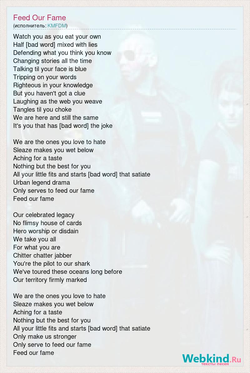 Watch you as you eat your own Half [bad word] mixed with lies Defending what you think you know Changing stories all the time Talking til your face is blue Tripping on your words Righteous in your knowledge But you haven't got a clue Laughing as the web you weave Tangles til you choke We are here and still the same It's you that has [bad word] the joke We are the ones you love to hate Sleaze makes you wet below Aching for a taste Nothing but the best for you All your little fits and starts [bad word] that satiate Urban legend drama Only serves to feed our fame Feed our fame Our celebrated legacy No flimsy house of cards Hero worship or disdain We take you all For what you are Chitter chatter jabber You're the pilot to our shark We've toured these oceans long before Our territory firmly marked We are the ones you love to hate Sleaze makes you wet below Aching for a taste Nothing but the best for you All your little fits and starts [bad word] that satiate Only make us stronger Only serve to feed our fame Feed our fame