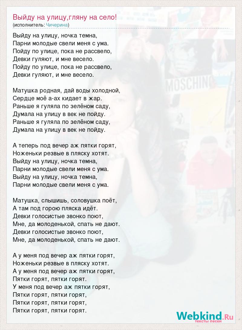 Выйду на улицу, ночка темна, Парни молодые свели меня с ума. Пойду по улице, пока не рассвело, Девки гуляют, и мне весело. Пойду по улице, пока не рассвело, Девки гуляют, и мне весело. Матушка родная, дай воды холодной, Сердце моё а-ах кидает в жар. Раньше я гуляла по зелёном саду, Думала на улицу в век не пойду. Раньше я гуляла по зелёном саду, Думала на улицу в век не пойду. А теперь под вечер аж пятки горят, Ноженьки резвые в пляску хотят. Выйду на улицу, ночка темна, Парни молодые свели меня с ума. Выйду на улицу, ночка темна, Парни молодые свели меня с ума. Матушка, слышишь, соловушка поёт, А там под горою пляска идёт. Девки голосистые звонко поют, Мне, да молоденькой, спать не дают. Девки голосистые звонко поют, Мне, да молоденькой, спать не дают. А у меня под вечер аж пятки горят, Ноженьки резвые в пляску хотят. А у меня под вечер аж пятки горят, Пятки горят, пятки горят. У меня под вечер аж пятки горят, Пятки горят, пятки горят, Пятки горят, пятки горят, Пятки горят, пятки горят.