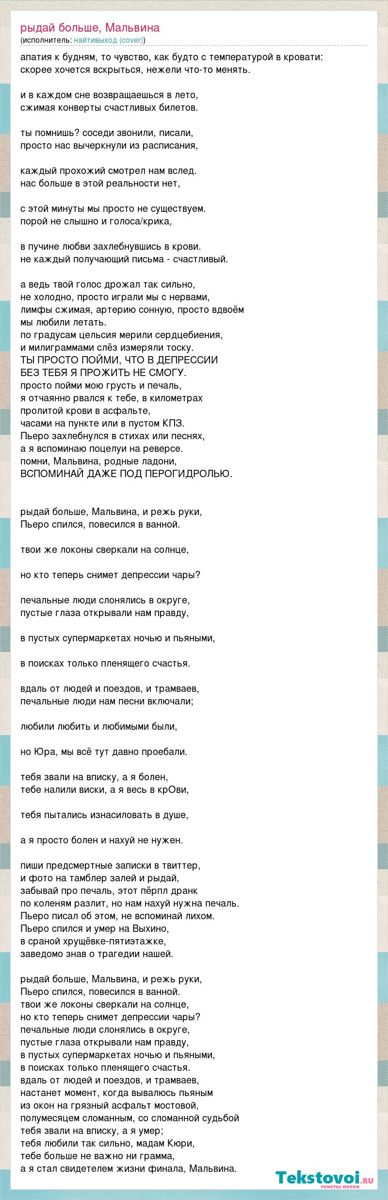 апатия к будням, то чувство, как будто с температурой в кровати: скорее хочется вскрыться, нежели что-то менять. и в каждом сне возвращаешься в лето, сжимая конверты счастливых билетов. ты помнишь? соседи звонили, писали, просто нас вычеркнули из расписания, каждый прохожий смотрел нам вслед. нас больше в этой реальности нет, с этой минуты мы просто не существуем. порой не слышно и голоса/крика, в пучине любви захлебнувшись в крови. не каждый получающий письма - счастливый. а ведь твой голос дрожал так сильно, не холодно, просто играли мы с нервами, лимфы сжимая, артерию сонную, просто вдвоём мы любили летать. по градусам цельсия мерили сердцебиения, и милиграммами слёз измеряли тоску. ТЫ ПРОСТО ПОЙМИ, ЧТО В ДЕПРЕССИИ БЕЗ ТЕБЯ Я ПРОЖИТЬ НЕ СМОГУ. просто пойми мою грусть и печаль, я отчаянно рвался к тебе, в километрах пролитой крови в асфальте, часами на пункте или в пустом КПЗ. Пьеро захлебнулся в стихах или песнях, а я вспоминаю поцелуи на реверсе. помни, Мальвина, родные ладони, ВСПОМИНАЙ ДАЖЕ ПОД ПЕРОГИДРОЛЬЮ. рыдай больше, Мальвина, и режь руки, Пьеро спился, повесился в ванной. твои же локоны сверкали на солнце, но кто теперь снимет депрессии чары? печальные люди слонялись в округе, пустые глаза открывали нам правду, в пустых супермаркетах ночью и пьяными, в поисках только пленящего счастья. вдаль от людей и поездов, и трамваев, печальные люди нам песни включали; любили любить и любимыми были, но Юра, мы всё тут давно проебали. тебя звали на вписку, а я болен, тебе налили виски, а я весь в крОви, тебя пытались изнасиловать в душе, а я просто болен и нахуй не нужен. пиши предсмертные записки в твиттер, и фото на тамблер залей и рыдай, забывай про печаль, этот пёрпл дранк по коленям разлит, но нам нахуй нужна печаль. Пьеро писал об этом, не вспоминай лихом. Пьеро спился и умер на Выхино, в сраной хрущёвке-пятиэтажке, заведомо знав о трагедии нашей. рыдай больше, Мальвина, и режь руки, Пьеро спился, повесился в ванной. твои же локоны сверкали на солнце, но кто теперь снимет депрессии чары? печальные люди слонялись в округе, пустые глаза открывали нам правду, в пустых супермаркетах ночью и пьяными, в поисках только пленящего счастья. вдаль от людей и поездов, и трамваев, настанет момент, когда вывалюсь пьяным из окон на грязный асфальт мостовой, полумесяцем сломанным, со сломанной судьбой тебя звали на вписку, а я умер; тебя любили так сильно, мадам Кюри, тебе больше не важно ни грамма, а я стал свидетелем жизни финала, Мальвина.