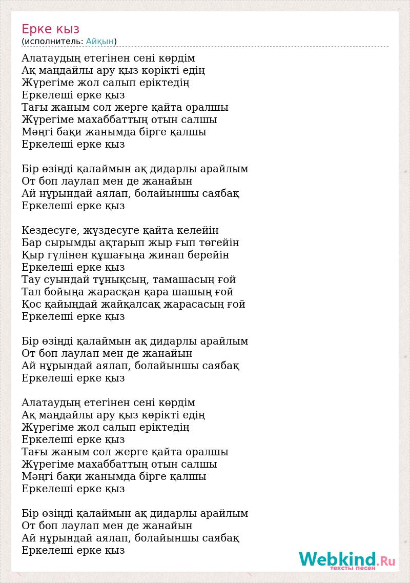 Алатаудың етегінен сені көрдім Ақ маңдайлы ару қыз көрікті едің Жүрегіме жол салып еріктедің Еркелеші ерке қыз Тағы жаным сол жерге қайта оралшы Жүрегіме махаббаттың отын салшы Мәңгі бақи жанымда бірге қалшы Еркелеші ерке қыз Бір өзіңді қалаймын ақ дидарлы арайлым От боп лаулап мен де жанайын Ай нұрындай аялап, болайыншы саябақ Еркелеші ерке қыз Кездесуге, жүздесуге қайта келейін Бар сырымды ақтарып жыр ғып төгейін Қыр гүлінен құшағыңа жинап берейін Еркелеші ерке қыз Тау суындай тұнықсың, тамашасың ғой Тал бойыңа жарасқан қара шашың ғой Қос қайыңдай жайқалсақ жарасасың ғой Еркелеші ерке қыз Бір өзіңді қалаймын ақ дидарлы арайлым От боп лаулап мен де жанайын Ай нұрындай аялап, болайыншы саябақ Еркелеші ерке қыз Алатаудың етегінен сені көрдім Ақ маңдайлы ару қыз көрікті едің Жүрегіме жол салып еріктедің Еркелеші ерке қыз Тағы жаным сол жерге қайта оралшы Жүрегіме махаббаттың отын салшы Мәңгі бақи жанымда бірге қалшы Еркелеші ерке қыз Бір өзіңді қалаймын ақ дидарлы арайлым От боп лаулап мен де жанайын Ай нұрындай аялап, болайыншы саябақ Еркелеші ерке қыз