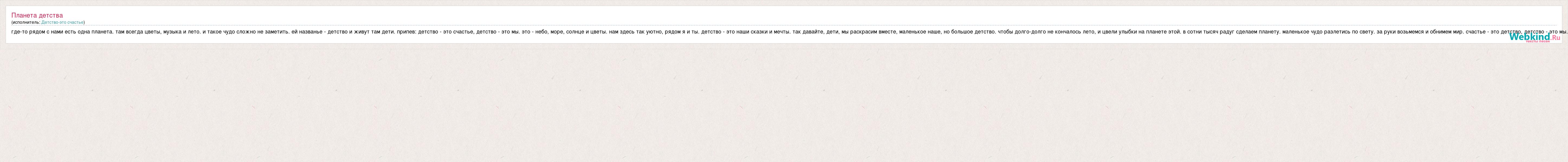 где-то рядом с нами есть одна планета. там всегда цветы, музыка и лето. и такое чудо сложно не заметить. ей названье - детство и живут там дети. припев: детство - это счастье, детство - это мы. это - небо, море, солнце и цветы. нам здесь так уютно, рядом я и ты. детство - это наши сказки и мечты. так давайте, дети, мы раскрасим вместе, маленькое наше, но большое детство. чтобы долго-долго не кончалось лето, и цвели улыбки на планете этой. в сотни тысяч радуг сделаем планету. маленькое чудо разлетись по свету. за руки возьмемся и обнимем мир. счастье - это детство, детство - это мы.