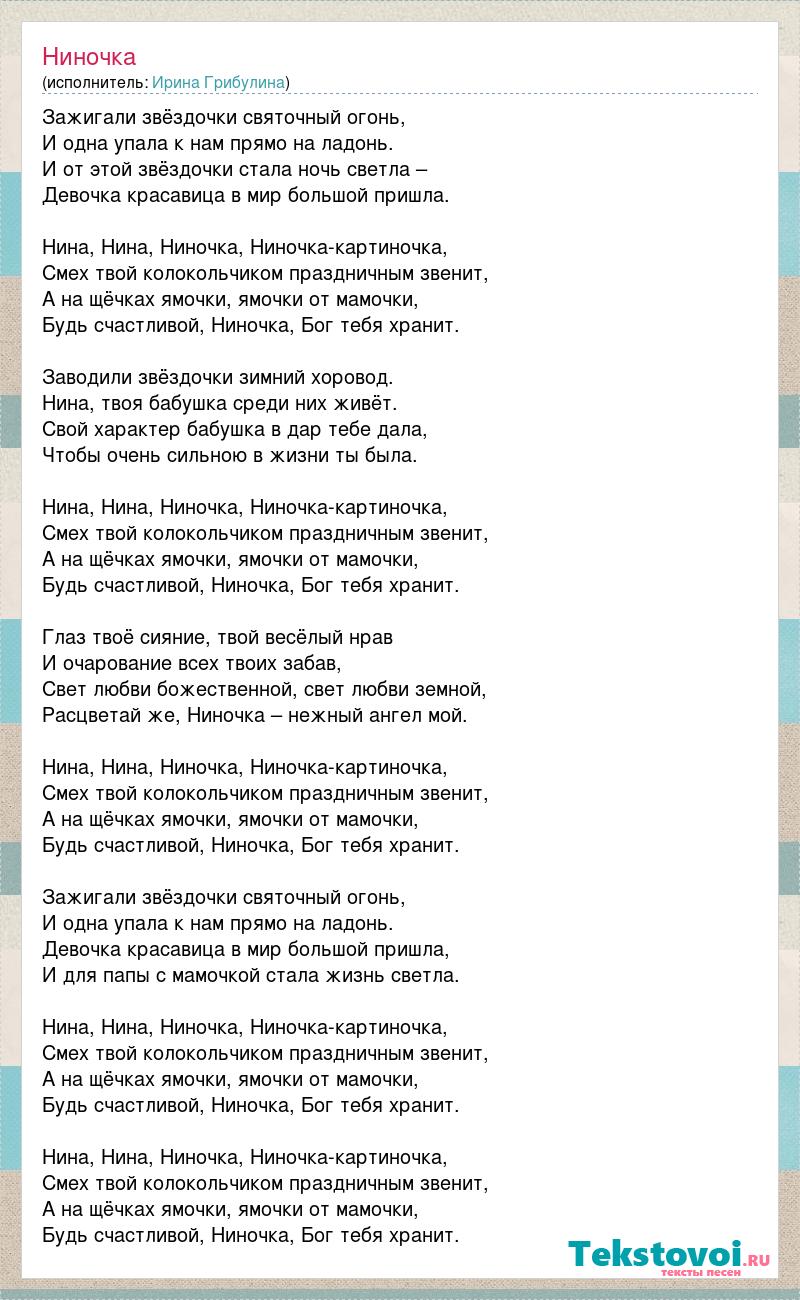 Зажигали звёздочки святочный огонь, И одна упала к нам прямо на ладонь. И от этой звёздочки стала ночь светла – Девочка красавица в мир большой пришла. Нина, Нина, Ниночка, Ниночка-картиночка, Смех твой колокольчиком праздничным звенит, А на щёчках ямочки, ямочки от мамочки, Будь счастливой, Ниночка, Бог тебя хранит. Заводили звёздочки зимний хоровод. Нина, твоя бабушка среди них живёт. Свой характер бабушка в дар тебе дала, Чтобы очень сильною в жизни ты была. Нина, Нина, Ниночка, Ниночка-картиночка, Смех твой колокольчиком праздничным звенит, А на щёчках ямочки, ямочки от мамочки, Будь счастливой, Ниночка, Бог тебя хранит. Глаз твоё сияние, твой весёлый нрав И очарование всех твоих забав, Свет любви божественной, свет любви земной, Расцветай же, Ниночка – нежный ангел мой. Нина, Нина, Ниночка, Ниночка-картиночка, Смех твой колокольчиком праздничным звенит, А на щёчках ямочки, ямочки от мамочки, Будь счастливой, Ниночка, Бог тебя хранит. Зажигали звёздочки святочный огонь, И одна упала к нам прямо на ладонь. Девочка красавица в мир большой пришла, И для папы с мамочкой стала жизнь светла. Нина, Нина, Ниночка, Ниночка-картиночка, Смех твой колокольчиком праздничным звенит, А на щёчках ямочки, ямочки от мамочки, Будь счастливой, Ниночка, Бог тебя хранит. Нина, Нина, Ниночка, Ниночка-картиночка, Смех твой колокольчиком праздничным звенит, А на щёчках ямочки, ямочки от мамочки, Будь счастливой, Ниночка, Бог тебя хранит.