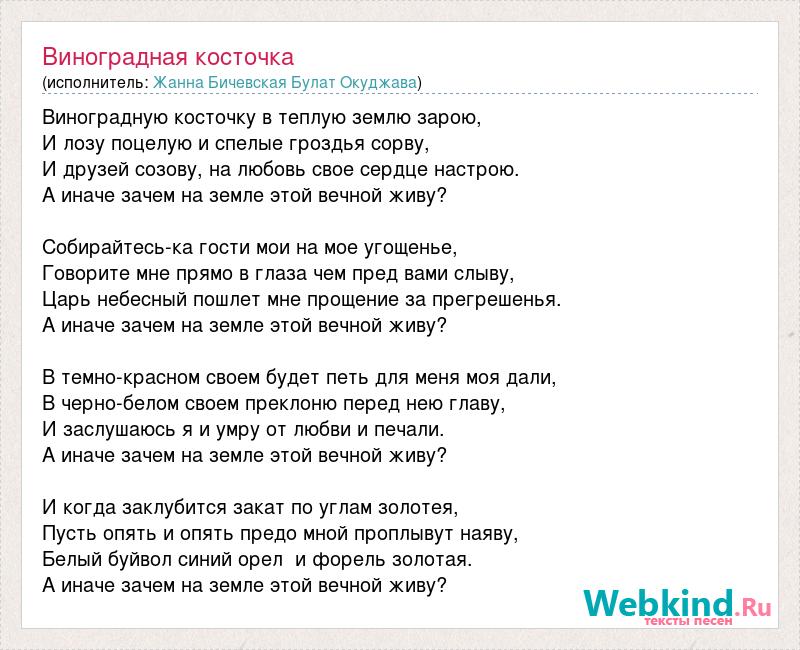 Виноградную косточку в теплую землю зарою, И лозу поцелую и спелые гроздья сорву, И друзей созову, на любовь свое сердце настрою. А иначе зачем на земле этой вечной живу? Собирайтесь-ка гости мои на мое угощенье, Говорите мне прямо в глаза чем пред вами слыву, Царь небесный пошлет мне прощение за прегрешенья. А иначе зачем на земле этой вечной живу? В темно-красном своем будет петь для меня моя дали, В черно-белом своем преклоню перед нею главу, И заслушаюсь я и умру от любви и печали. А иначе зачем на земле этой вечной живу? И когда заклубится закат по углам золотея, Пусть опять и опять предо мной проплывут наяву, Белый буйвол синий орел и форель золотая. А иначе зачем на земле этой вечной живу?