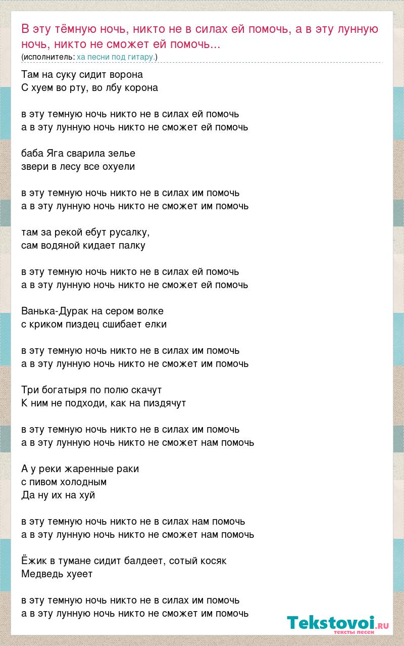 Там на суку сидит ворона С хуем во рту, во лбу корона в эту темную ночь никто не в силах ей помочь а в эту лунную ночь никто не сможет ей помочь баба Яга сварила зелье звери в лесу все охуели в эту темную ночь никто не в силах им помочь а в эту лунную ночь никто не сможет им помочь там за рекой ебут русалку, сам водяной кидает палку в эту темную ночь никто не в силах ей помочь а в эту лунную ночь никто не сможет ей помочь Ванька-Дурак на сером волке с криком пиздец сшибает елки в эту темную ночь никто не в силах им помочь а в эту лунную ночь никто не сможет им помочь Три богатыря по полю скачут К ним не подходи, как на пиздячут в эту темную ночь никто не в силах им помочь а в эту лунную ночь никто не сможет нам помочь А у реки жаренные раки с пивом холодным Да ну их на хуй в эту темную ночь никто не в силах нам помочь а в эту лунную ночь никто не сможет нам помочь Ёжик в тумане сидит балдеет, сотый косяк Медведь хуеет в эту темную ночь никто не в силах им помочь а в эту лунную ночь никто не сможет им помочь