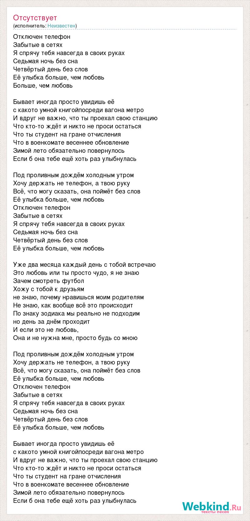 Отключен телефон Забытые в сетях Я спрячу тебя навсегда в своих руках Седьмая ночь без сна Четвёртый день без слов Её улыбка больше, чем любовь Больше, чем любовь Бывает иногда просто увидишь её с какото умной книгойпосреди вагона метро И вдруг не важно, что ты проехал свою станцию Что кто-то ждёт и никто не проси остаться Что ты студент на гране отчисления Что в военкомате весеннее обновление Зимой лето обязательно повернулось Если б она тебе ещё хоть раз улыбнулась Под проливным дождём холодным утром Хочу держать не телефон, а твою руку Всё, что могу сказать, она поймёт без слов Её улыбка больше, чем любовь Отключен телефон Забытые в сетях Я спрячу тебя навсегда в своих руках Седьмая ночь без сна Четвёртый день без слов Её улыбка больше, чем любовь Уже два месяца каждый день с тобой встречаю Это любовь или ты просто чудо, я не знаю Зачем смотреть футбол Хожу с тобой к друзьям не знаю, почему нравишься моим родителям Не знаю, как вообще всё это происходит По знаку зодиака мы реально не подходим но день за днём проходит И если это не любовь, Она и не нужна мне, просто будь со мною Под проливным дождём холодным утром Хочу держать не телефон, а твою руку Всё, что могу сказать, она поймёт без слов Её улыбка больше, чем любовь Отключен телефон Забытые в сетях Я спрячу тебя навсегда в своих руках Седьмая ночь без сна Четвёртый день без слов Её улыбка больше, чем любовь Бывает иногда просто увидишь её с какото умной книгойпосреди вагона метро И вдруг не важно, что ты проехал свою станцию Что кто-то ждёт и никто не проси остаться Что ты студент на гране отчисления Что в военкомате весеннее обновление Зимой лето обязательно повернулось Если б она тебе ещё хоть раз улыбнулась