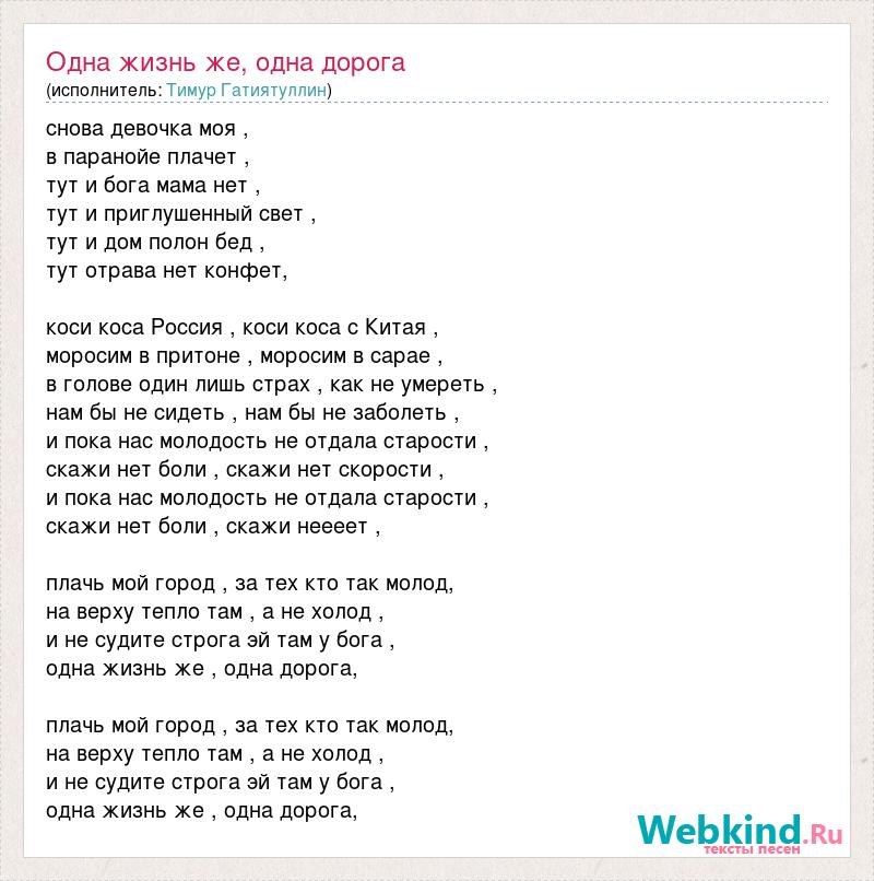 снова девочка моя , в паранойе плачет , тут и бога мама нет , тут и приглушенный свет , тут и дом полон бед , тут отрава нет конфет, коси коса Россия , коси коса с Китая , моросим в притоне , моросим в сарае , в голове один лишь страх , как не умереть , нам бы не сидеть , нам бы не заболеть , и пока нас молодость не отдала старости , скажи нет боли , скажи нет скорости , и пока нас молодость не отдала старости , скажи нет боли , скажи неееет , плачь мой город , за тех кто так молод, на верху тепло там , а не холод , и не судите строга эй там у бога , одна жизнь же , одна дорога, плачь мой город , за тех кто так молод, на верху тепло там , а не холод , и не судите строга эй там у бога , одна жизнь же , одна дорога,