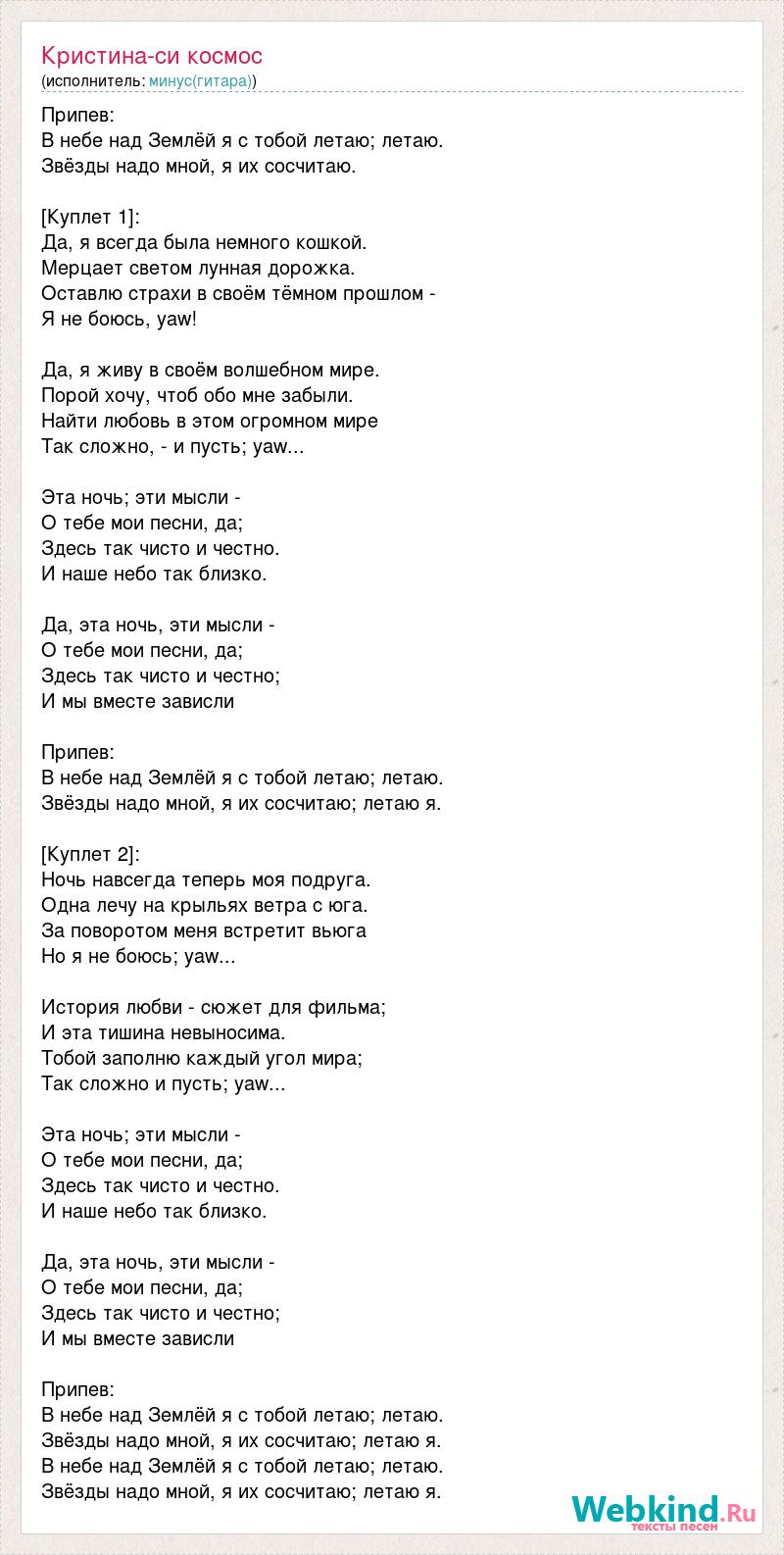 Припев: В небе над Землёй я с тобой летаю; летаю. Звёзды надо мной, я их сосчитаю. [Куплет 1]: Да, я всегда была немного кошкой. Мерцает светом лунная дорожка. Оставлю страхи в своём тёмном прошлом - Я не боюсь, yaw! Да, я живу в своём волшебном мире. Порой хочу, чтоб обо мне забыли. Найти любовь в этом огромном мире Так сложно, - и пусть; yaw... Эта ночь; эти мысли - О тебе мои песни, да; Здесь так чисто и честно. И наше небо так близко. Да, эта ночь, эти мысли - О тебе мои песни, да; Здесь так чисто и честно; И мы вместе зависли Припев: В небе над Землёй я с тобой летаю; летаю. Звёзды надо мной, я их сосчитаю; летаю я. [Куплет 2]: Ночь навсегда теперь моя подруга. Одна лечу на крыльях ветра с юга. За поворотом меня встретит вьюга Но я не боюсь; yaw... История любви - сюжет для фильма; И эта тишина невыносима. Тобой заполню каждый угол мира; Так сложно и пусть; yaw... Эта ночь; эти мысли - О тебе мои песни, да; Здесь так чисто и честно. И наше небо так близко. Да, эта ночь, эти мысли - О тебе мои песни, да; Здесь так чисто и честно; И мы вместе зависли Припев: В небе над Землёй я с тобой летаю; летаю. Звёзды надо мной, я их сосчитаю; летаю я. В небе над Землёй я с тобой летаю; летаю. Звёзды надо мной, я их сосчитаю; летаю я.
