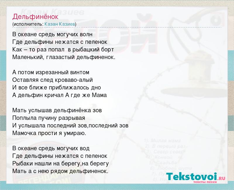 В океане средь могучих волн Где дельфины нежатся c пеленок Как – то раз попал в рыбацкий борт Маленький, глазастый дельфиненок. А потом изрезанный винтом Оставляя след кроваво-алый И все ближе приближалось дно А дельфин кричал А где же Мама Мать услышав дельфинёнка зов Поплыла пучину разрывая И услышала последний зов,последний зов Мамочка прости я умираю. В океане средь могучих вод Где дельфины нежатся с пеленок Рыбаки нашли на берегу,на берегу Мать а с нею рядом дельфиненок.