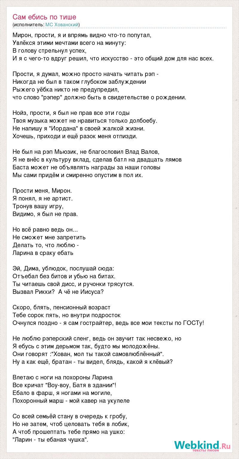 Мирон, прости, я и впрямь видно что-то попутал, Увлёкся этими мечтами всего на минуту: В голову стрельнул успех, И я с чего-то вдруг решил, что искусство - это общий дом для нас всех. Прости, я думал, можно просто начать читать рэп - Никогда не был в таком глубоком заблуждении Рыжего уёбка никто не предупредил, что слово "рэпер" должно быть в свидетельстве о рождении. Нойз, прости, я был не прав все эти годы Твоя музыка может не нравиться только долбоебу. Не напишу я "Иордана" в своей жалкой жизни. Хочешь, приходи и ещё разок меня отпизди. Не был на рэп Мьюзик, не благословил Влад Валов, Я не внёс в культуру вклад, сделав батл на двадцать лямов Баста может не объявлять награды за наши головы Мы сами придём и смиренно опустим в пол их. Прости меня, Мирон. Я понял, я не артист. Тронув вашу игру, Видимо, я был не прав. Но всё равно ведь он... Не сможет мне запретить Делать то, что люблю - Ларина в сраку ебать Эй, Дима, ублюдок, послушай сюда: Отъебал без битов и убью на битах. Ты читаешь свой дисс, и ручонки трясутся. Вызвал Рикки? А чё не Иисуса? Скоро, блять, пенсионный возраст Тебе сорок пять, но внутри подросток Очнулся поздно - я сам гострайтер, ведь все мои тексты по ГОСТу! Не люблю рэперский сленг, ведь он звучит так несвежо, но Я ебусь с этим дерьмом так, будто мы молодожёны. Они говорят :"Хован, мол ты такой самовлюблённый". Ну а как ещё, братан - ты видел, блядь, какой я клёвый? Влетаю с ноги на похороны Ларина Все кричат "Воу-воу, Батя в здании"! Ебало в фарш, я ногами на могиле, Похоронный марш - мой кавер на укулеле Со всей семьёй стану в очередь к гробу, Но не затем, чтоб целовать тебя в лобик, А чтоб прошептать тебе прямо на ушко: "Ларин - ты ебаная чушка".