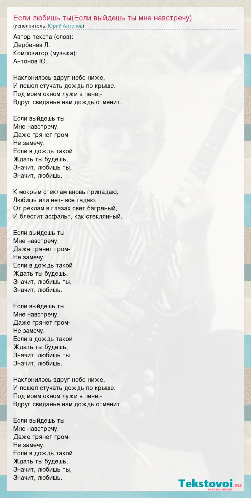 Автор текста (слов): Дербенев Л. Композитор (музыка): Антонов Ю. Наклонилось вдруг небо ниже, И пошел стучать дождь по крыше. Под моим окном лужи в пене,- Вдруг свиданье нам дождь отменит. Если выйдешь ты Мне навстречу, Даже грянет гром- Не замечу. Если в дождь такой Ждать ты будешь, Значит, любишь ты, Значит, любишь. К мокрым стеклам вновь припадаю, Любишь или нет- все гадаю. От реклам в глазах свет багряный, И блестит асфальт, как стеклянный. Если выйдешь ты Мне навстречу, Даже грянет гром- Не замечу. Если в дождь такой Ждать ты будешь, Значит, любишь ты, Значит, любишь. Если выйдешь ты Мне навстречу, Даже грянет гром- Не замечу. Если в дождь такой Ждать ты будешь, Значит, любишь ты, Значит, любишь. Наклонилось вдруг небо ниже, И пошел стучать дождь по крыше. Под моим окном лужи в пене,- Вдруг свиданье нам дождь отменит. Если выйдешь ты Мне навстречу, Даже грянет гром- Не замечу. Если в дождь такой Ждать ты будешь, Значит, любишь ты, Значит, любишь.