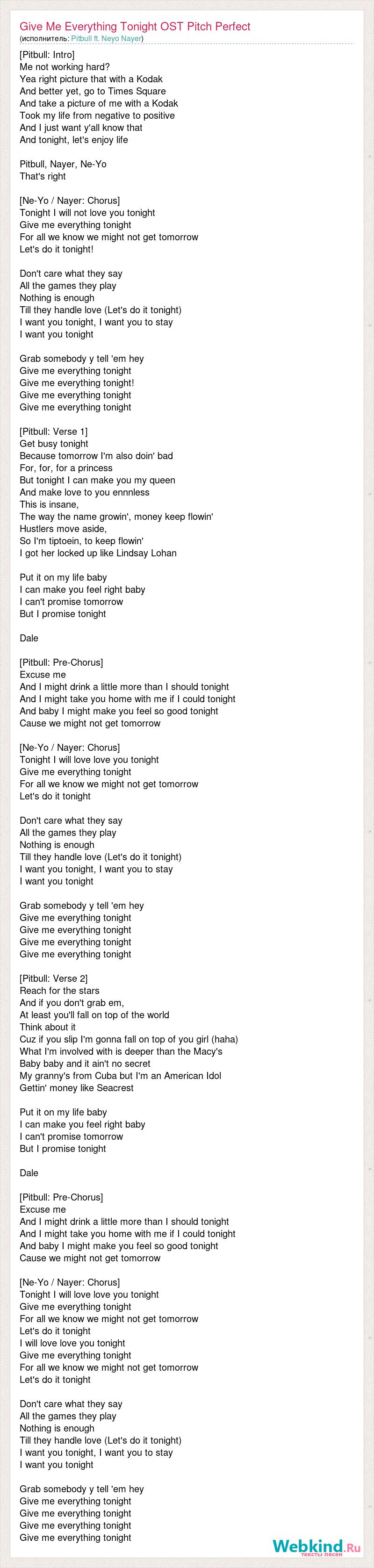 [Pitbull: Intro] Me not working hard? Yea right picture that with a Kodak And better yet, go to Times Square And take a picture of me with a Kodak Took my life from negative to positive And I just want y'all know that And tonight, let's enjoy life Pitbull, Nayer, Ne-Yo That's right [Ne-Yo / Nayer: Chorus] Tonight I will not love you tonight Give me everything tonight For all we know we might not get tomorrow Let's do it tonight! Don't care what they say All the games they play Nothing is enough Till they handle love (Let's do it tonight) I want you tonight, I want you to stay I want you tonight Grab somebody y tell 'em hey Give me everything tonight Give me everything tonight! Give me everything tonight Give me everything tonight [Pitbull: Verse 1] Get busy tonight Because tomorrow I'm also doin' bad For, for, for a princess But tonight I can make you my queen And make love to you ennnless This is insane, The way the name growin', money keep flowin' Hustlers move aside, So I'm tiptoein, to keep flowin' I got her locked up like Lindsay Lohan Put it on my life baby I can make you feel right baby I can't promise tomorrow But I promise tonight Dale [Pitbull: Pre-Chorus] Excuse me And I might drink a little more than I should tonight And I might take you home with me if I could tonight And baby I might make you feel so good tonight Cause we might not get tomorrow [Ne-Yo / Nayer: Chorus] Tonight I will love love you tonight Give me everything tonight For all we know we might not get tomorrow Let's do it tonight Don't care what they say All the games they play Nothing is enough Till they handle love (Let's do it tonight) I want you tonight, I want you to stay I want you tonight Grab somebody y tell 'em hey Give me everything tonight Give me everything tonight Give me everything tonight Give me everything tonight [Pitbull: Verse 2] Reach for the stars And if you don't grab em, At least you'll fall on top of the world Think about it Cuz if you slip I'm gonna fall on top of you girl (haha) What I'm involved with is deeper than the Macy's Baby baby and it ain't no secret My granny's from Cuba but I'm an American Idol Gettin' money like Seacrest Put it on my life baby I can make you feel right baby I can't promise tomorrow But I promise tonight Dale [Pitbull: Pre-Chorus] Excuse me And I might drink a little more than I should tonight And I might take you home with me if I could tonight And baby I might make you feel so good tonight Cause we might not get tomorrow [Ne-Yo / Nayer: Chorus] Tonight I will love love you tonight Give me everything tonight For all we know we might not get tomorrow Let's do it tonight I will love love you tonight Give me everything tonight For all we know we might not get tomorrow Let's do it tonight Don't care what they say All the games they play Nothing is enough Till they handle love (Let's do it tonight) I want you tonight, I want you to stay I want you tonight Grab somebody y tell 'em hey Give me everything tonight Give me everything tonight Give me everything tonight Give me everything tonight