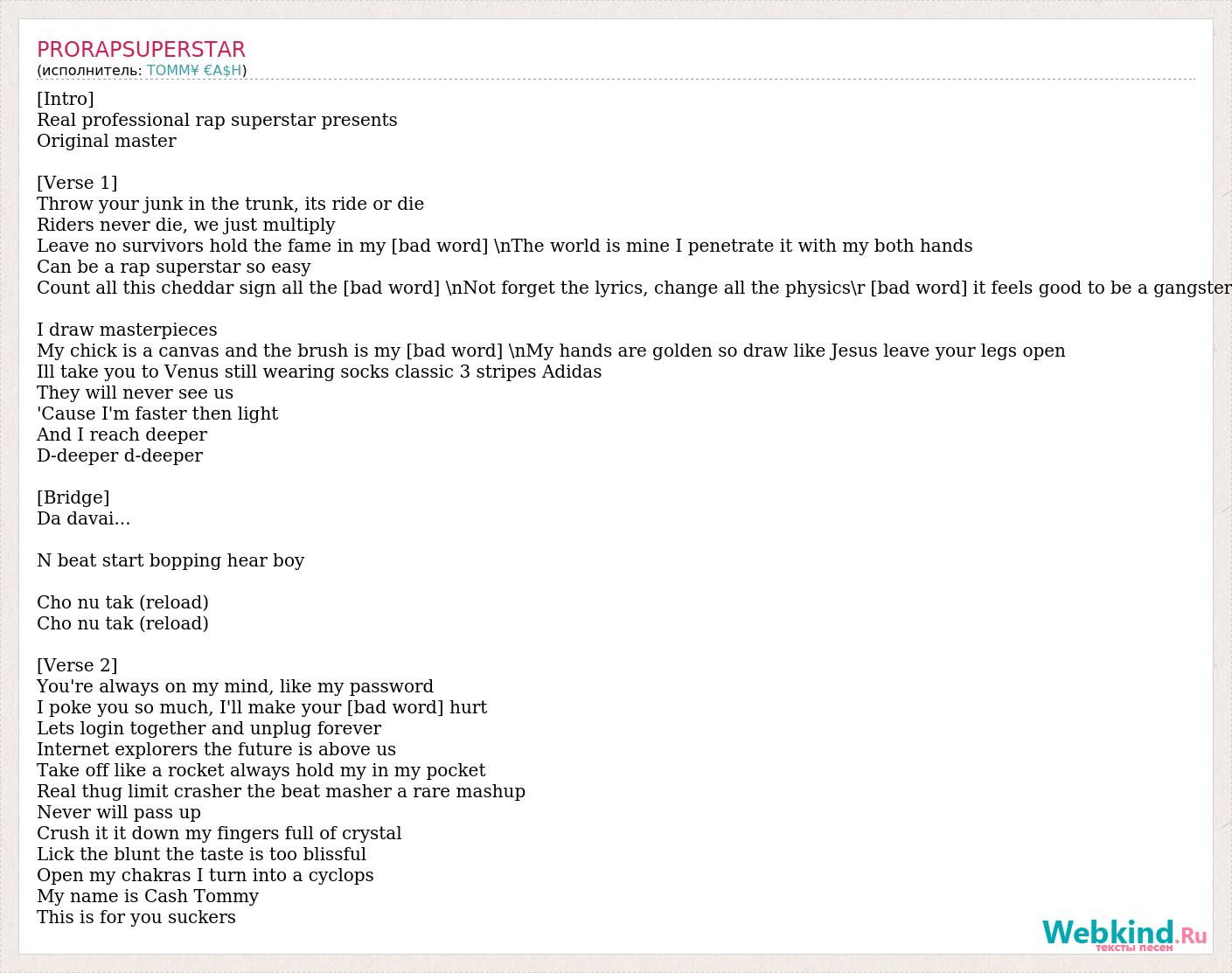 [Intro] Real professional rap superstar presents Original master [Verse 1] Throw your junk in the trunk, its ride or die Riders never die, we just multiply Leave no survivors hold the fame in my [bad word] \nThe world is mine I penetrate it with my both hands Can be a rap superstar so easy Count all this cheddar sign all the [bad word] \nNot forget the lyrics, change all the physics\r [bad word] it feels good to be a gangster I draw masterpieces My chick is a canvas and the brush is my [bad word] \nMy hands are golden so draw like Jesus leave your legs open Ill take you to Venus still wearing socks classic 3 stripes Adidas They will never see us 'Cause I'm faster then light And I reach deeper D-deeper d-deeper [Bridge] Da davai... N beat start bopping hear boy Cho nu tak (reload) Cho nu tak (reload) [Verse 2] You're always on my mind, like my password I poke you so much, I'll make your [bad word] hurt Lets login together and unplug forever Internet explorers the future is above us Take off like a rocket always hold my in my pocket Real thug limit crasher the beat masher a rare mashup Never will pass up Crush it it down my fingers full of crystal Lick the blunt the taste is too blissful Open my chakras I turn into a cyclops My name is Cash Tommy This is for you suckers