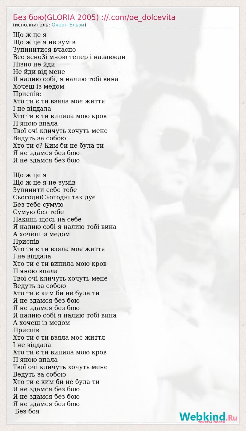 А как ты думаешь, о чем песня "Без бою(GLORIA 2005) ://.com/oe_dolcevita" ?