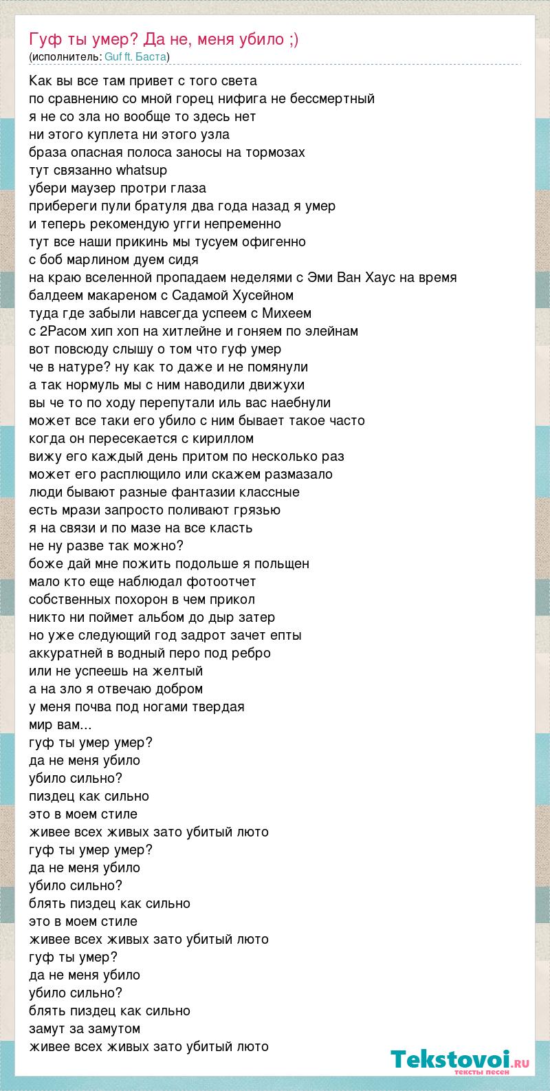 Как вы все там привет с того света по сравнению со мной горец нифига не бессмертный я не со зла но вообще то здесь нет ни этого куплета ни этого узла браза опасная полоса заносы на тормозах тут связанно whatsup убери маузер протри глаза прибереги пули братуля два года назад я умер и теперь рекомендую угги непременно тут все наши прикинь мы тусуем офигенно с боб марлином дуем сидя на краю вселенной пропадаем неделями с Эми Ван Хаус на время балдеем макареном с Садамой Хусейном туда где забыли навсегда успеем с Михеем с 2Pacом хип хоп на хитлейне и гоняем по элейнам вот повсюду слышу о том что гуф умер че в натуре? ну как то даже и не помянули а так нормуль мы с ним наводили движухи вы че то по ходу перепутали иль вас наебнули может все таки его убило с ним бывает такое часто когда он пересекается с кириллом вижу его каждый день притом по несколько раз может его расплющило или скажем размазало люди бывают разные фантазии классные есть мрази запросто поливают грязью я на связи и по мазе на все класть не ну разве так можно? боже дай мне пожить подольше я польщен мало кто еще наблюдал фотоотчет собственных похорон в чем прикол никто ни поймет альбом до дыр затер но уже следующий год задрот зачет епты аккуратней в водный перо под ребро или не успеешь на желтый а на зло я отвечаю добром у меня почва под ногами твердая мир вам... гуф ты умер умер? да не меня убило убило сильно? пиздец как сильно это в моем стиле живее всех живых зато убитый люто гуф ты умер умер? да не меня убило убило сильно? блять пиздец как сильно это в моем стиле живее всех живых зато убитый люто гуф ты умер? да не меня убило убило сильно? блять пиздец как сильно замут за замутом живее всех живых зато убитый люто