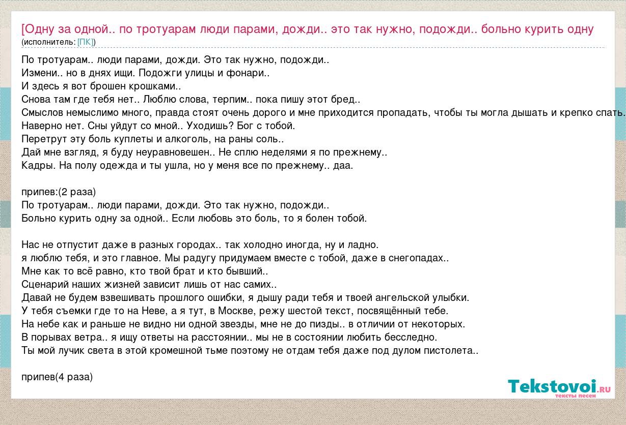 По тротуарам.. люди парами, дожди. Это так нужно, подожди.. Измени.. но в днях ищи. Подожги улицы и фонари.. И здесь я вот брошен крошками.. Снова там где тебя нет.. Люблю слова, терпим.. пока пишу этот бред.. Смыслов немыслимо много, правда стоят очень дорого и мне приходится пропадать, чтобы ты могла дышать и крепко спать. Наверно нет. Сны уйдут со мной.. Уходишь? Бог с тобой. Перетрут эту боль куплеты и алкоголь, на раны соль.. Дай мне взгляд, я буду неуравновешен.. Не сплю неделями я по прежнему.. Кадры. На полу одежда и ты ушла, но у меня все по прежнему.. даа. припев:(2 раза) По тротуарам.. люди парами, дожди. Это так нужно, подожди.. Больно курить одну за одной.. Если любовь это боль, то я болен тобой. Нас не отпустит даже в разных городах.. так холодно иногда, ну и ладно. я люблю тебя, и это главное. Мы радугу придумаем вместе с тобой, даже в снегопадах.. Мне как то всё равно, кто твой брат и кто бывший.. Сценарий наших жизней зависит лишь от нас самих.. Давай не будем взвешивать прошлого ошибки, я дышу ради тебя и твоей ангельской улыбки. У тебя съемки где то на Неве, а я тут, в Москве, режу шестой текст, посвящённый тебе. На небе как и раньше не видно ни одной звезды, мне не до пизды.. в отличии от некоторых. В порывах ветра.. я ищу ответы на расстоянии.. мы не в состоянии любить бесследно. Ты мой лучик света в этой кромешной тьме поэтому не отдам тебя даже под дулом пистолета.. припев(4 раза)