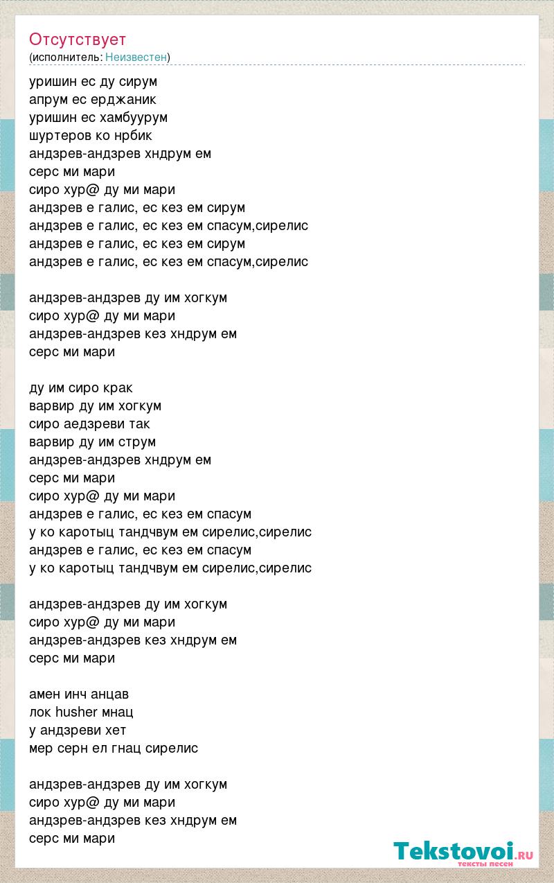 уришин ес ду сирум апрум ес ерджаник уришин ес хамбуурум шуртеров ко нрбик андзрев-андзрев хндрум ем серс ми мари сиро хур@ ду ми мари андзрев е галис, ес кез ем сирум андзрев е галис, ес кез ем спасум,сирелис андзрев е галис, ес кез ем сирум андзрев е галис, ес кез ем спасум,сирелис андзрев-андзрев ду им хогкум сиро хур@ ду ми мари андзрев-андзрев кез хндрум ем серс ми мари ду им сиро крак варвир ду им хогкум сиро аедзреви так варвир ду им струм андзрев-андзрев хндрум ем серс ми мари сиро хур@ ду ми мари андзрев е галис, ес кез ем спасум у ко каротыц тандчвум ем сирелис,сирелис андзрев е галис, ес кез ем спасум у ко каротыц тандчвум ем сирелис,сирелис андзрев-андзрев ду им хогкум сиро хур@ ду ми мари андзрев-андзрев кез хндрум ем серс ми мари амен инч анцав лок husher мнац у андзреви хет мер серн ел гнац сирелис андзрев-андзрев ду им хогкум сиро хур@ ду ми мари андзрев-андзрев кез хндрум ем серс ми мари