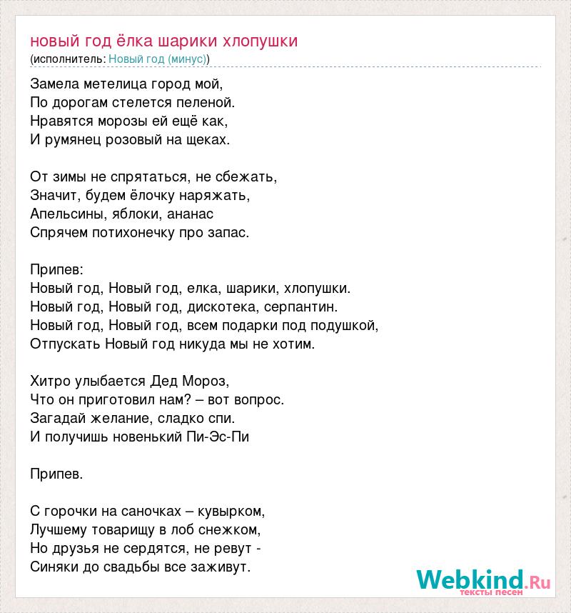 Замела метелица город мой, По дорогам стелется пеленой. Нравятся морозы ей ещё как, И румянец розовый на щеках. От зимы не спрятаться, не сбежать, Значит, будем ёлочку наряжать, Апельсины, яблоки, ананас Спрячем потихонечку про запас. Припев: Новый год, Новый год, елка, шарики, хлопушки. Новый год, Новый год, дискотека, серпантин. Новый год, Новый год, всем подарки под подушкой, Отпускать Новый год никуда мы не хотим. Хитро улыбается Дед Мороз, Что он приготовил нам? – вот вопрос. Загадай желание, сладко спи. И получишь новенький Пи-Эс-Пи Припев. С горочки на саночках – кувырком, Лучшему товарищу в лоб снежком, Но друзья не сердятся, не ревут - Синяки до свадьбы все заживут.