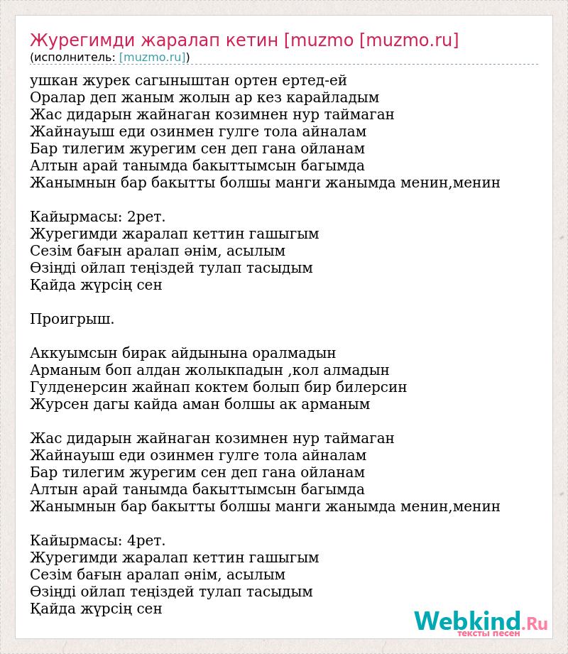 ушкан журек сагыныштан ортен ертед-ей Оралар деп жаным жолын ар кез карайладым Жас дидарын жайнаган козимнен нур таймаган Жайнауыш еди озинмен гулге тола айналам Бар тилегим журегим сен деп гана ойланам Алтын арай танымда бакыттымсын багымда Жанымнын бар бакытты болшы манги жанымда менин,менин Кайырмасы: 2рет. Журегимди жаралап кеттин гашыгым Сезім бағын аралап әнім, асылым Өзіңді ойлап теңіздей тулап тасыдым Қайда жүрсің сен Проигрыш. Аккуымсын бирак айдынына оралмадын Арманым боп алдан жолыкпадын ,кол алмадын Гулденерсин жайнап коктем болып бир билерсин Журсен дагы кайда аман болшы ак арманым Жас дидарын жайнаган козимнен нур таймаган Жайнауыш еди озинмен гулге тола айналам Бар тилегим журегим сен деп гана ойланам Алтын арай танымда бакыттымсын багымда Жанымнын бар бакытты болшы манги жанымда менин,менин Кайырмасы: 4рет. Журегимди жаралап кеттин гашыгым Сезім бағын аралап әнім, асылым Өзіңді ойлап теңіздей тулап тасыдым Қайда жүрсің сен