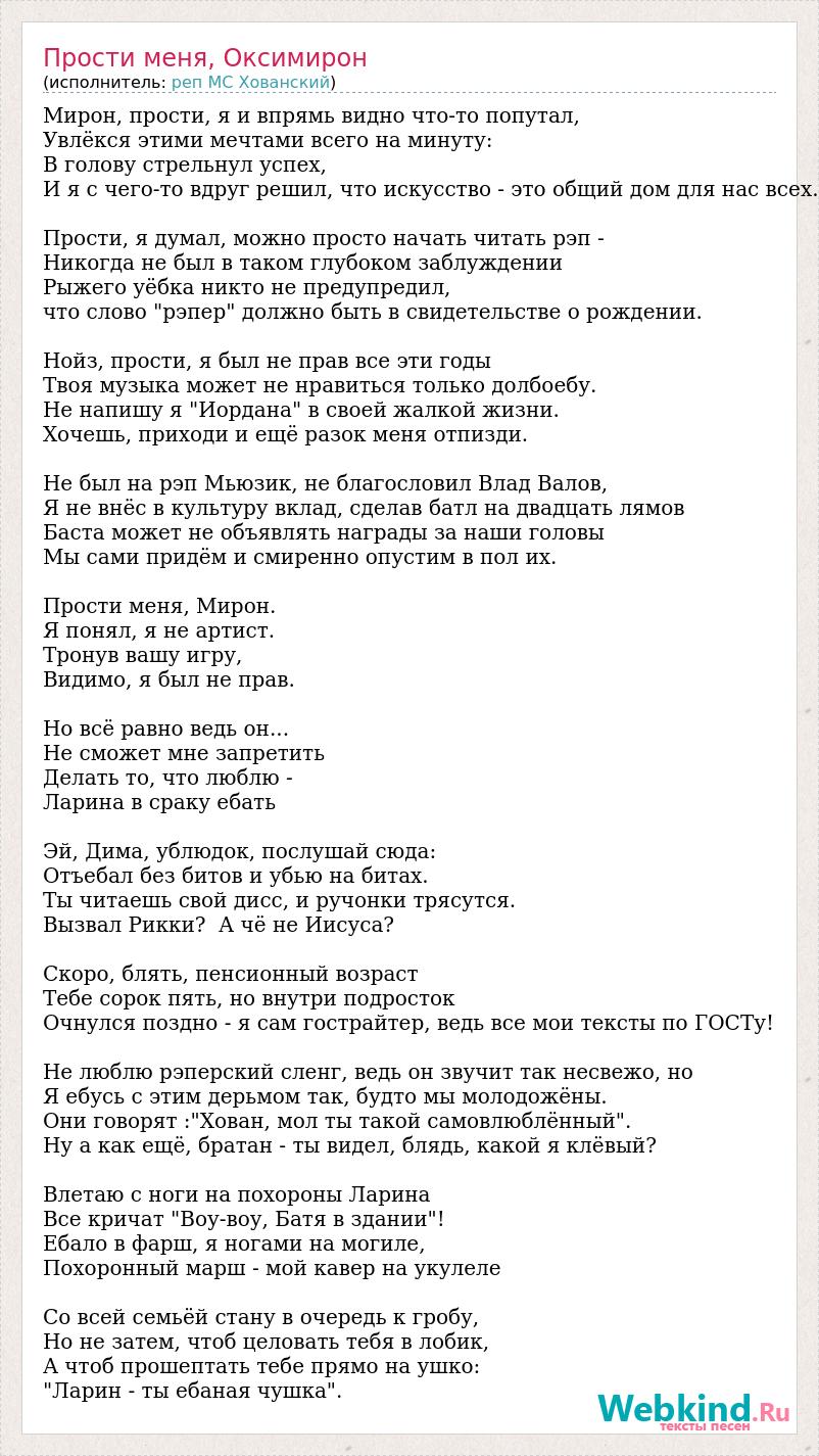 Мирон, прости, я и впрямь видно что-то попутал, Увлёкся этими мечтами всего на минуту: В голову стрельнул успех, И я с чего-то вдруг решил, что искусство - это общий дом для нас всех. Прости, я думал, можно просто начать читать рэп - Никогда не был в таком глубоком заблуждении Рыжего уёбка никто не предупредил, что слово "рэпер" должно быть в свидетельстве о рождении. Нойз, прости, я был не прав все эти годы Твоя музыка может не нравиться только долбоебу. Не напишу я "Иордана" в своей жалкой жизни. Хочешь, приходи и ещё разок меня отпизди. Не был на рэп Мьюзик, не благословил Влад Валов, Я не внёс в культуру вклад, сделав батл на двадцать лямов Баста может не объявлять награды за наши головы Мы сами придём и смиренно опустим в пол их. Прости меня, Мирон. Я понял, я не артист. Тронув вашу игру, Видимо, я был не прав. Но всё равно ведь он... Не сможет мне запретить Делать то, что люблю - Ларина в сраку ебать Эй, Дима, ублюдок, послушай сюда: Отъебал без битов и убью на битах. Ты читаешь свой дисс, и ручонки трясутся. Вызвал Рикки? А чё не Иисуса? Скоро, блять, пенсионный возраст Тебе сорок пять, но внутри подросток Очнулся поздно - я сам гострайтер, ведь все мои тексты по ГОСТу! Не люблю рэперский сленг, ведь он звучит так несвежо, но Я ебусь с этим дерьмом так, будто мы молодожёны. Они говорят :"Хован, мол ты такой самовлюблённый". Ну а как ещё, братан - ты видел, блядь, какой я клёвый? Влетаю с ноги на похороны Ларина Все кричат "Воу-воу, Батя в здании"! Ебало в фарш, я ногами на могиле, Похоронный марш - мой кавер на укулеле Со всей семьёй стану в очередь к гробу, Но не затем, чтоб целовать тебя в лобик, А чтоб прошептать тебе прямо на ушко: "Ларин - ты ебаная чушка".