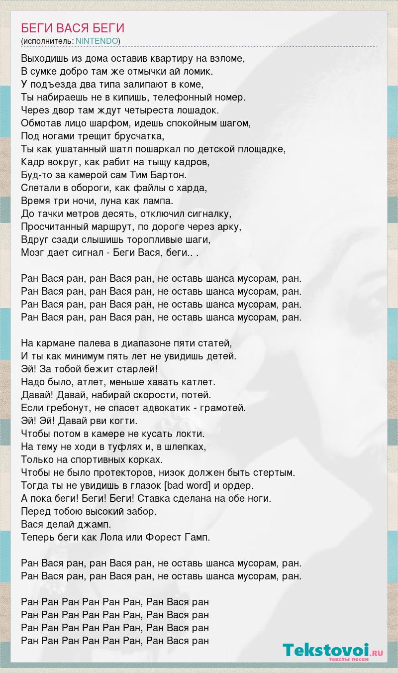 Выходишь из дома оставив квартиру на взломе, В сумке добро там же отмычки ай ломик. У подъезда два типа залипают в коме, Ты набираешь не в кипишь, телефонный номер. Через двор там ждут четыреста лошадок. Обмотав лицо шарфом, идешь спокойным шагом, Под ногами трещит брусчатка, Ты как ушатанный шатл пошаркал по детской площадке, Кадр вокруг, как рабит на тыщу кадров, Буд-то за камерой сам Тим Бартон. Слетали в обороги, как файлы с харда, Время три ночи, луна как лампа. До тачки метров десять, отключил сигналку, Просчитанный маршрут, по дороге через арку, Вдруг сзади слышишь торопливые шаги, Мозг дает сигнал - Беги Вася, беги.. . Ран Вася ран, ран Вася ран, не оставь шанса мусорам, ран. Ран Вася ран, ран Вася ран, не оставь шанса мусорам, ран. Ран Вася ран, ран Вася ран, не оставь шанса мусорам, ран. Ран Вася ран, ран Вася ран, не оставь шанса мусорам, ран. На кармане палева в диапазоне пяти статей, И ты как минимум пять лет не увидишь детей. Эй! За тобой бежит старлей! Надо было, атлет, меньше хавать катлет. Давай! Давай, набирай скорости, потей. Если гребонут, не спасет адвокатик - грамотей. Эй! Эй! Давай рви когти. Чтобы потом в камере не кусать локти. На тему не ходи в туфлях и, в шлепках, Только на спортивных корках. Чтобы не было протекторов, низок должен быть стертым. Тогда ты не увидишь в глазок [bad word] и ордер. А пока беги! Беги! Беги! Ставка сделана на обе ноги. Перед тобою высокий забор. Вася делай джамп. Теперь беги как Лола или Форест Гамп. Ран Вася ран, ран Вася ран, не оставь шанса мусорам, ран. Ран Вася ран, ран Вася ран, не оставь шанса мусорам, ран. Ран Ран Ран Ран Ран Ран, Ран Вася ран Ран Ран Ран Ран Ран Ран, Ран Вася ран Ран Ран Ран Ран Ран Ран, Ран Вася ран Ран Ран Ран Ран Ран Ран, Ран Вася ран