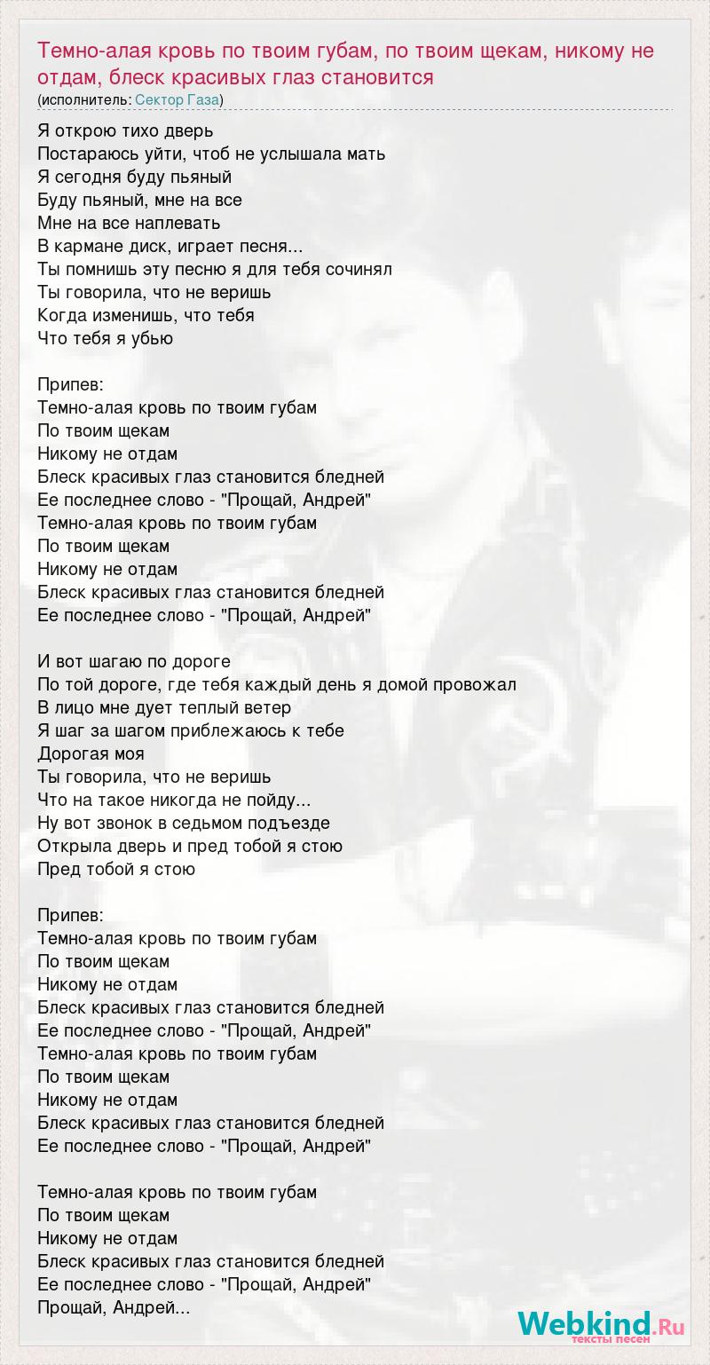 Я открою тихо дверь Постараюсь уйти, чтоб не услышала мать Я сегодня буду пьяный Буду пьяный, мне на все Мне на все наплевать В кармане диск, играет песня... Ты помнишь эту песню я для тебя сочинял Ты говорила, что не веришь Когда изменишь, что тебя Что тебя я убью Припев: Темно-алая кровь по твоим губам По твоим щекам Никому не отдам Блеск красивых глаз становится бледней Ее последнее слово - "Прощай, Андрей" Темно-алая кровь по твоим губам По твоим щекам Никому не отдам Блеск красивых глаз становится бледней Ее последнее слово - "Прощай, Андрей" И вот шагаю по дороге По той дороге, где тебя каждый день я домой провожал В лицо мне дует теплый ветер Я шаг за шагом приблежаюсь к тебе Дорогая моя Ты говорила, что не веришь Что на такое никогда не пойду... Ну вот звонок в седьмом подъезде Открыла дверь и пред тобой я стою Пред тобой я стою Припев: Темно-алая кровь по твоим губам По твоим щекам Никому не отдам Блеск красивых глаз становится бледней Ее последнее слово - "Прощай, Андрей" Темно-алая кровь по твоим губам По твоим щекам Никому не отдам Блеск красивых глаз становится бледней Ее последнее слово - "Прощай, Андрей" Темно-алая кровь по твоим губам По твоим щекам Никому не отдам Блеск красивых глаз становится бледней Ее последнее слово - "Прощай, Андрей" Прощай, Андрей...