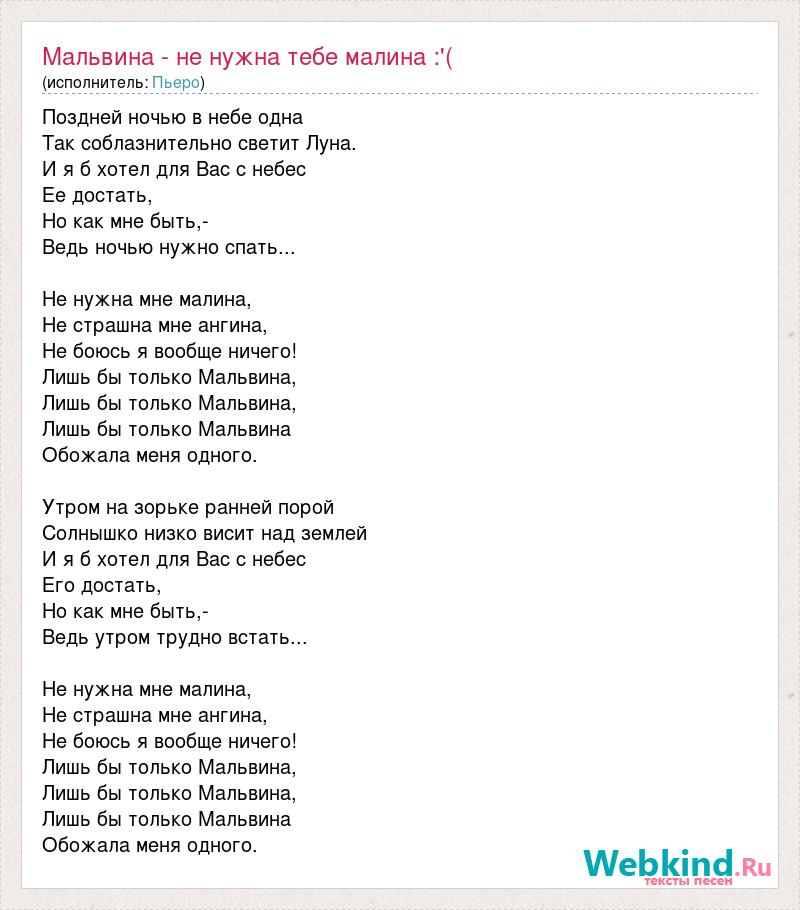 Поздней ночью в небе одна Так соблазнительно светит Луна. И я б хотел для Вас с небес Ее достать, Но как мне быть,- Ведь ночью нужно спать... Не нужна мне малина, Не страшна мне ангина, Не боюсь я вообще ничего! Лишь бы только Мальвина, Лишь бы только Мальвина, Лишь бы только Мальвина Обожала меня одного. Утром на зорьке ранней порой Солнышко низко висит над землей И я б хотел для Вас с небес Его достать, Но как мне быть,- Ведь утром трудно встать... Не нужна мне малина, Не страшна мне ангина, Не боюсь я вообще ничего! Лишь бы только Мальвина, Лишь бы только Мальвина, Лишь бы только Мальвина Обожала меня одного.