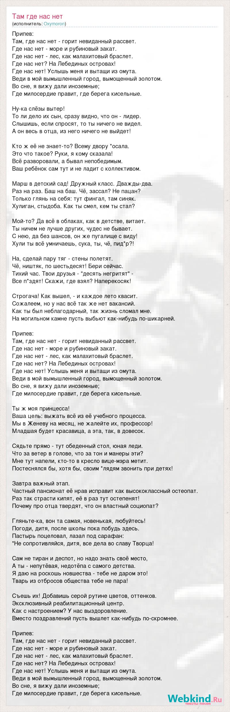 Припев: Там, где нас нет - горит невиданный рассвет. Где нас нет - море и рубиновый закат. Где нас нет - лес, как малахитовый браслет. Где нас нет? На Лебединых островах! Где нас нет! Услышь меня и вытащи из омута. Веди в мой вымышленный город, вымощенный золотом. Во сне, я вижу дали иноземные; Где милосердие правит, где берега кисельные. Ну-ка слёзы вытер! То ли дело их сын, сразу видно, что он - лидер. Слышишь, если спросят, то ты ничего не видел. А он весь в отца, из него ничего не выйдет! Кто ж её не знает-то? Всему двору *осала. Это что такое? Руки, я кому сказала! Всё разворовали, а бывал непобедимым. Ваш ребёнок сам тут и не ладит с коллективом. Марш в детский сад! Дружный класс. Дважды-два. Раз на раз. Баш на баш. Чё, зассал? Не пацан? Только глянь на себя: тут фингал, там синяк. Хулиган, стыдоба. Как ты смел, кем ты стал? Мой-то? Да всё в облаках, как в детстве, витает. Ты ничем не лучше других, чудес не бывает. С нею, да без шансов, он же пугалище с виду! Хули ты всё умничаешь, сука, ты, чё, пид*р?! На, сделай пару тяг - стены полетят. Чё, ништяк, по шестьдесят! Бери сейчас. Тихий час. Твои друзья - "десять негритят" - Все п*здят! Скажи, где взял? Наперекосяк! Строгача! Как вышел, - и каждое лето квасит. Сожалеем, но у нас всё так же нет вакансий. Как ты был неблагодарный, так жизнь сломал мне. На могильном камне пусть выбьют как-нибудь по-шикарней. Припев: Там, где нас нет - горит невиданный рассвет. Где нас нет - море и рубиновый закат. Где нас нет - лес, как малахитовый браслет. Где нас нет? На Лебединых островах! Где нас нет! Услышь меня и вытащи из омута. Веди в мой вымышленный город, вымощенный золотом. Во сне, я вижу дали иноземные; Где милосердие правит, где берега кисельные. Ты ж моя принцесса! Ваша цель: выжать всё из её учебного процесса. Мы в Женеву на месяц, не жалейте их, профессор! Младшая будет красавица, а эта, так, в довесок. Сядьте прямо - тут обеденный стол, юная леди. Что за ветер в голове, что за тон и манеры эти? Мне тут напели, кто-то в кресло вице-мэра метит. Постеснялся бы, хотя бы, своим *лядям звонить при детях! Завтра важный этап. Частный пансионат её нрав исправит как высококлассный остеопат. Раз так страсти кипят, её в раз тут остепенят! Почему про отца твердят, что он властный социопат? Гляньте-ка, вон та самая, новенькая, любуйтесь! Погоди, дитя, после школы пока побудь здесь. Пастырь поцеловал, лазал под сарафан: "Не сопротивляйся, дитя, все дела во славу Творца! Сам не тиран и деспот, но надо знать своё место, А ты - непутёвая, недотёпа с самого детства. Я даю на роскошь новшества - тебе не даром это! Тварь из отбросов общества тебе не пара! Съешь их! Добавишь серой рутине цветов, оттенков. Эксклюзивный реабилитационный центр. Как с настроением? У нас выздоровление. Вместо поздравлений пусть вышлет как-нибудь по-скромнее. Припев: Там, где нас нет - горит невиданный рассвет. Где нас нет - море и рубиновый закат. Где нас нет - лес, как малахитовый браслет. Где нас нет? На Лебединых островах! Где нас нет! Услышь меня и вытащи из омута. Веди в мой вымышленный город, вымощенный золотом. Во сне, я вижу дали иноземные; Где милосердие правит, где берега кисельные.