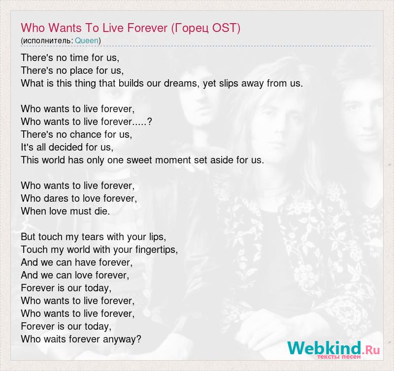 There's no time for us, There's no place for us, What is this thing that builds our dreams, yet slips away from us. Who wants to live forever, Who wants to live forever.....? There's no chance for us, It's all decided for us, This world has only one sweet moment set aside for us. Who wants to live forever, Who dares to love forever, When love must die. But touch my tears with your lips, Touch my world with your fingertips, And we can have forever, And we can love forever, Forever is our today, Who wants to live forever, Who wants to live forever, Forever is our today, Who waits forever anyway?