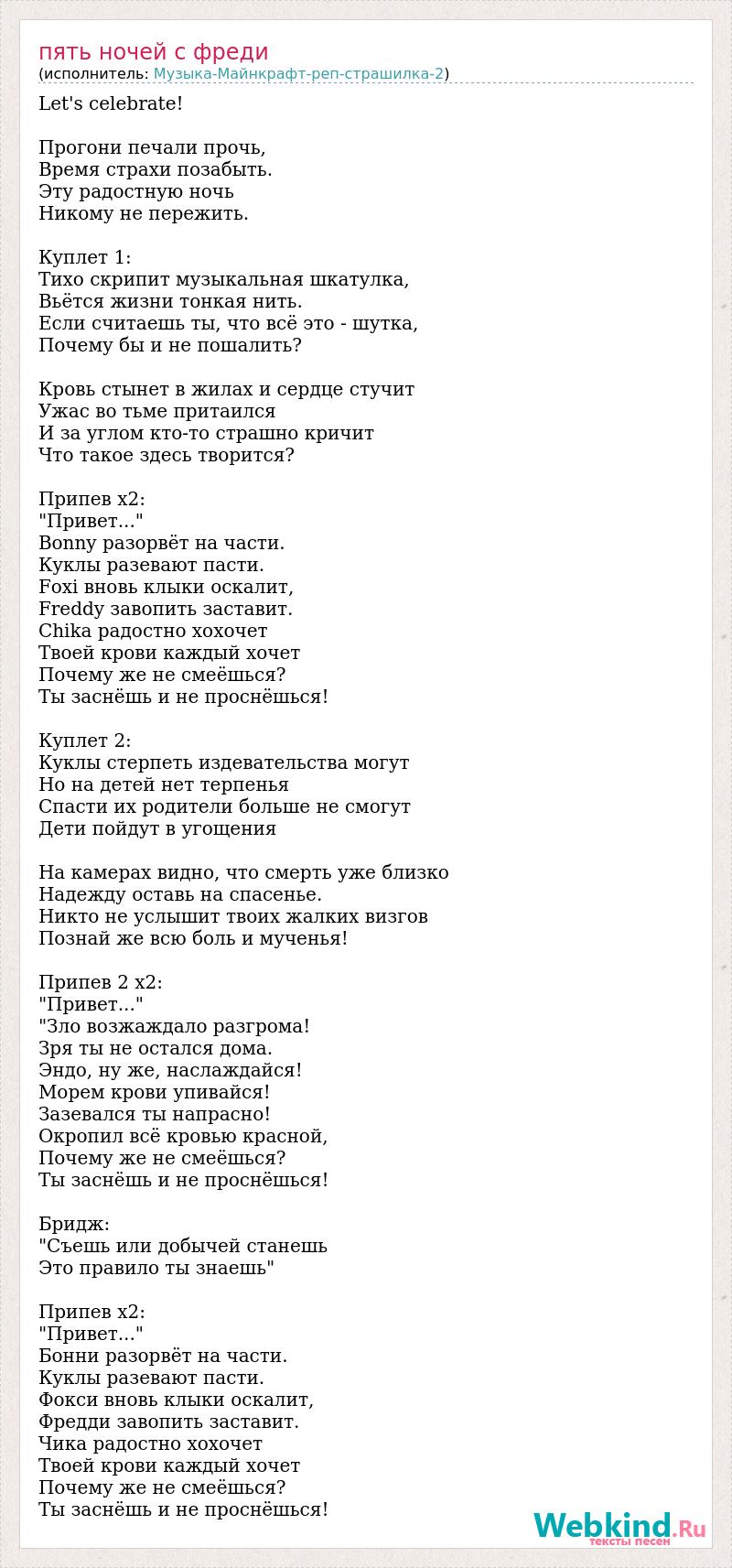 Let's celebrate! Прогони печали прочь, Время страхи позабыть. Эту радостную ночь Никому не пережить. Куплет 1: Тихо скрипит музыкальная шкатулка, Вьётся жизни тонкая нить. Если считаешь ты, что всё это - шутка, Почему бы и не пошалить? Кровь стынет в жилах и сердце стучит Ужас во тьме притаился И за углом кто-то страшно кричит Что такое здесь творится? Припев x2: "Привет..." Bonny разорвёт на части. Куклы разевают пасти. Foxi вновь клыки оскалит, Freddy завопить заставит. Chika радостно хохочет Твоей крови каждый хочет Почему же не смеёшься? Ты заснёшь и не проснёшься! Куплет 2: Куклы стерпеть издевательства могут Но на детей нет терпенья Спасти их родители больше не смогут Дети пойдут в угощения На камерах видно, что смерть уже близко Надежду оставь на спасенье. Никто не услышит твоих жалких визгов Познай же всю боль и мученья! Припев 2 x2: "Привет..." "Зло возжаждало разгрома! Зря ты не остался дома. Эндо, ну же, наслаждайся! Морем крови упивайся! Зазевался ты напрасно! Окропил всё кровью красной, Почему же не смеёшься? Ты заснёшь и не проснёшься! Бридж: "Съешь или добычей станешь Это правило ты знаешь" Припев x2: "Привет..." Бонни разорвёт на части. Куклы разевают пасти. Фокси вновь клыки оскалит, Фредди завопить заставит. Чика радостно хохочет Твоей крови каждый хочет Почему же не смеёшься? Ты заснёшь и не проснёшься!