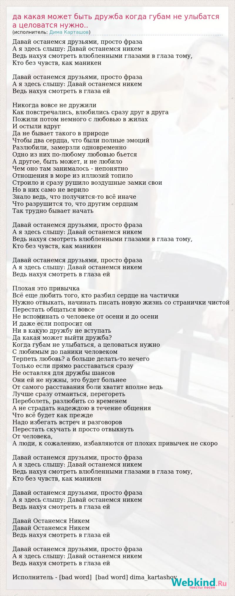 Давай останемся друзьями, просто фраза А я здесь слышу: Давай останемся никем Ведь нахуя смотреть влюбленными глазами в глаза тому, Кто без чувств, как маникен Давай останемся друзьями, просто фраза А я здесь слышу: Давай останемся никем Ведь нахуя смотреть в глаза ей Никогда вовсе не дружили Как повстречались, влюбились сразу друг в друга Пожили потом немного с любовью в жилах И остыли вдруг Да не бывает такого в природе Чтобы два сердца, что были полные эмоций Разлюбили, замерзли одновременно Одно из них по-любому любовью бьется А другое, быть может, и не любило Чем оно там занималось - непонятно Отношения в море из иллюзий топило Строило и сразу рушило воздушные замки свои Но в них само не верило Знало ведь, что получится-то всё иначе Что разрушится то, что другим сердцам Так трудно бывает начать Давай останемся друзьями, просто фраза А я здесь слышу: Давай останемся никем Ведь нахуя смотреть влюбленными глазами в глаза тому, Кто без чувств, как маникен Давай останемся друзьями, просто фраза А я здесь слышу: Давай останемся никем Ведь нахуя смотреть в глаза ей Плохая это привычка Всё еще любить того, кто разбил сердце на частички Нужно отвыкать, начинать писать новую жизнь со странички чистой Перестать общаться вовсе Не вспоминать о человеке от осени и до осени И даже если попросит он Ни в какую дружбу не вступать Да какая может выйти дружба? Когда губам не улыбаться, а целоваться нужно С любимым до паники человеком Терпеть любовь? а больше делать-то нечего Только если прямо расставаться сразу Не оставляя для дружбы шансов Они ей не нужны, это будет больнее От самого расставания боли хватит вполне ведь Лучше сразу отмаиться, перегореть Переболеть, разлюбить со временем А не страдать надеждою в течение общения Что всё будет как прежде Надо избегать встреч и разговоров Перестать скучать и просто отвыкнуть От человека, А люди, к сожалению, избавляются от плохих привычек не скоро Давай останемся друзьями, просто фраза А я здесь слышу: Давай останемся никем Ведь нахуя смотреть влюбленными глазами в глаза тому, Кто без чувств, как маникен Давай останемся друзьями, просто фраза А я здесь слышу: Давай останемся никем Ведь нахуя смотреть в глаза ей Давай Останемся Никем Давай Останемся Никем Ведь нахуя смотреть в глаза ей Давай останемся друзьями, просто фраза А я здесь слышу: Давай останемся никем Ведь нахуя смотреть в глаза ей Исполнитель - [bad word] [bad word] dima_kartashov