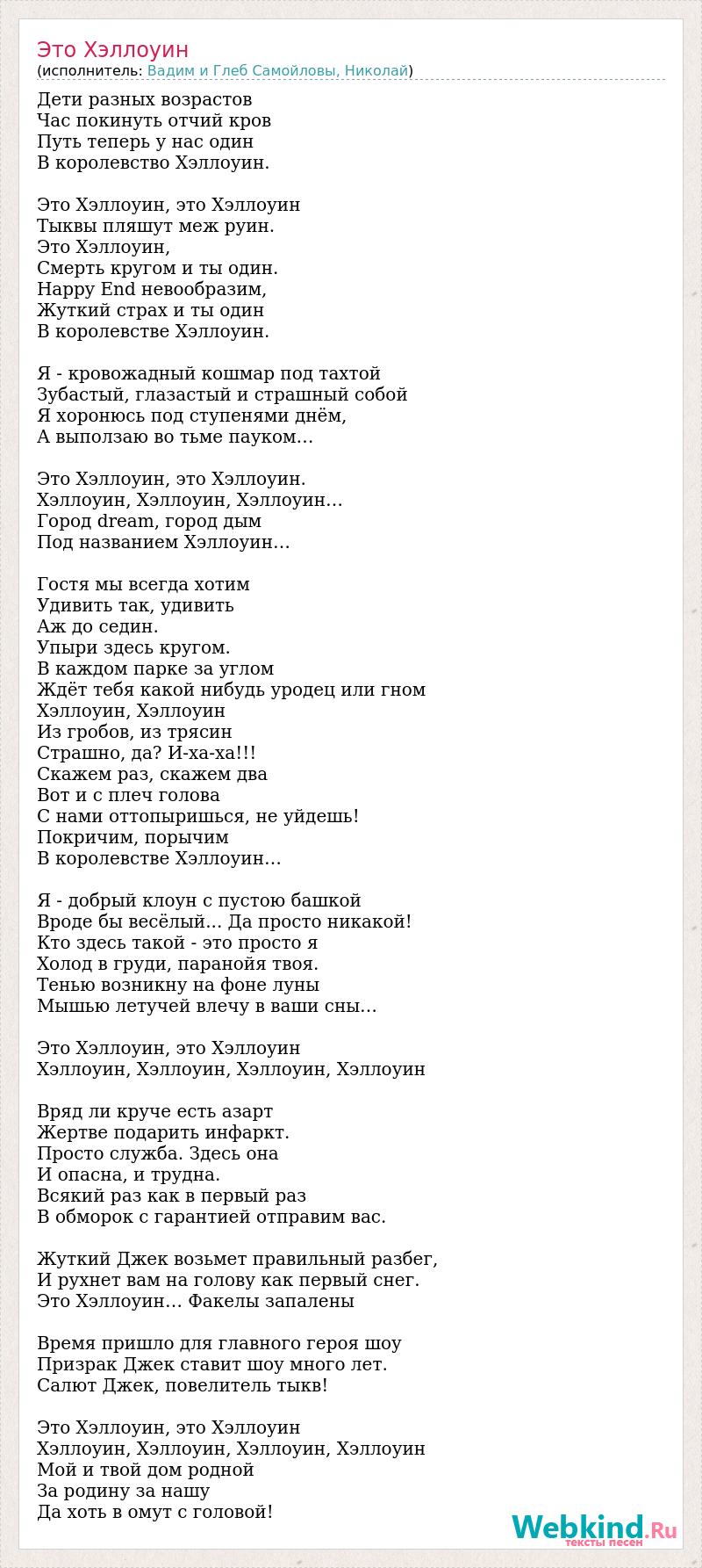 Дети разных возрастов Час покинуть отчий кров Путь теперь у нас один В королевство Хэллоуин. Это Хэллоуин, это Хэллоуин Тыквы пляшут меж руин. Это Хэллоуин, Смерть кругом и ты один. Happy End невообразим, Жуткий страх и ты один В королевстве Хэллоуин. Я - кровожадный кошмар под тахтой Зубастый, глазастый и страшный собой Я хоронюсь под ступенями днём, А выползаю во тьме пауком… Это Хэллоуин, это Хэллоуин. Хэллоуин, Хэллоуин, Хэллоуин… Город dream, город дым Под названием Хэллоуин… Гостя мы всегда хотим Удивить так, удивить Аж до седин. Упыри здесь кругом. В каждом парке за углом Ждёт тебя какой нибудь уродец или гном Хэллоуин, Хэллоуин Из гробов, из трясин Страшно, да? И-ха-ха!!! Скажем раз, скажем два Вот и с плеч голова С нами оттопыришься, не уйдешь! Покричим, порычим В королевстве Хэллоуин… Я - добрый клоун с пустою башкой Вроде бы весёлый... Да просто никакой! Кто здесь такой - это просто я Холод в груди, паранойя твоя. Тенью возникну на фоне луны Мышью летучей влечу в ваши сны… Это Хэллоуин, это Хэллоуин Хэллоуин, Хэллоуин, Хэллоуин, Хэллоуин Вряд ли круче есть азарт Жертве подарить инфаркт. Просто служба. Здесь она И опасна, и трудна. Всякий раз как в первый раз В обморок с гарантией отправим вас. Жуткий Джек возьмет правильный разбег, И рухнет вам на голову как первый снег. Это Хэллоуин… Факелы запалены Время пришло для главного героя шоу Призрак Джек ставит шоу много лет. Салют Джек, повелитель тыкв! Это Хэллоуин, это Хэллоуин Хэллоуин, Хэллоуин, Хэллоуин, Хэллоуин Мой и твой дом родной За родину за нашу Да хоть в омут с головой!