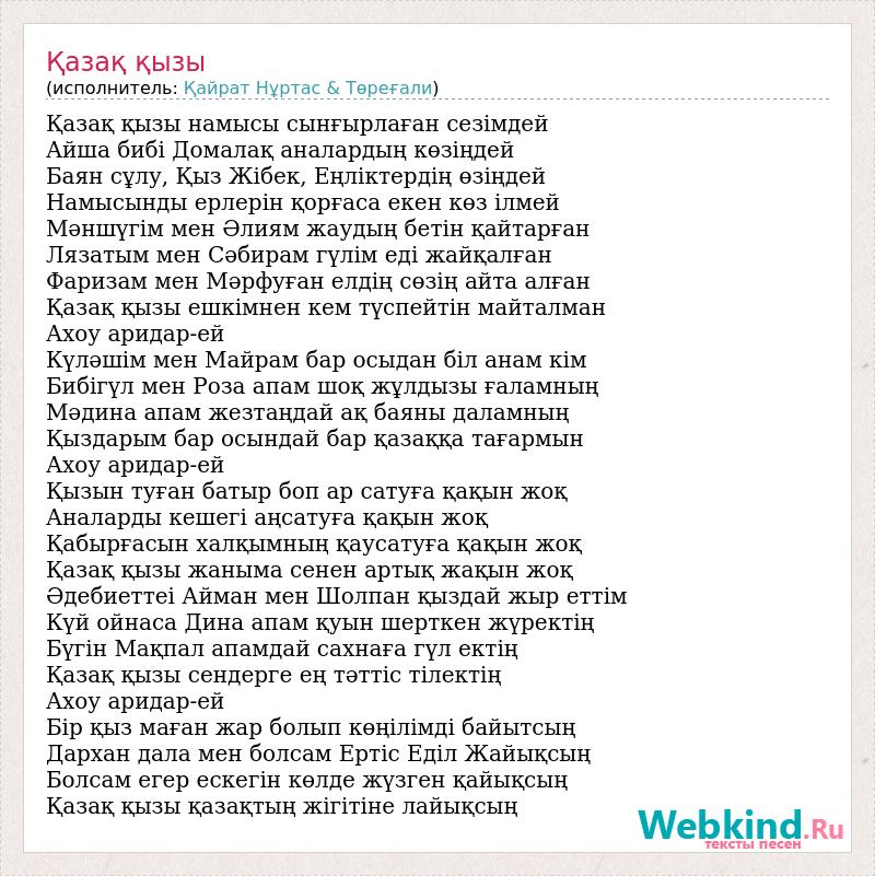 Қазақ қызы намысы сынғырлаған сезімдей Айша бибі Домалақ аналардың көзіңдей Баян сұлу, Қыз Жібек, Еңліктердің өзіңдей Намысынды ерлерін қорғаса екен көз ілмей Мәншүгім мен Әлиям жаудың бетін қайтарған Лязатым мен Сәбирам гүлім еді жайқалған Фаризам мен Мәрфуған елдің сөзің айта алған Қазақ қызы ешкімнен кем түспейтін майталман Ахоу аридар-ей Күләшім мен Майрам бар осыдан біл анам кім Бибігүл мен Роза апам шоқ жұлдызы ғаламның Мәдина апам жезтаңдай ақ баяны даламның Қыздарым бар осындай бар қазаққа тағармын Ахоу аридар-ей Қызын туған батыр боп ар сатуға қақын жоқ Аналарды кешегі аңсатуға қақын жоқ Қабырғасын халқымның қаусатуға қақын жоқ Қазақ қызы жаныма сенен артық жақын жоқ Әдебиеттеі Айман мен Шолпан қыздай жыр еттім Күй ойнаса Дина апам қуын шерткен жүректің Бүгін Мақпал апамдай сахнаға гүл ектің Қазақ қызы сендерге ең тәттіс тілектің Ахоу аридар-ей Бір қыз маған жар болып көңілімді байытсың Дархан дала мен болсам Ертіс Еділ Жайықсың Болсам егер ескегін көлде жүзген қайықсың Қазақ қызы қазақтың жігітіне лайықсың