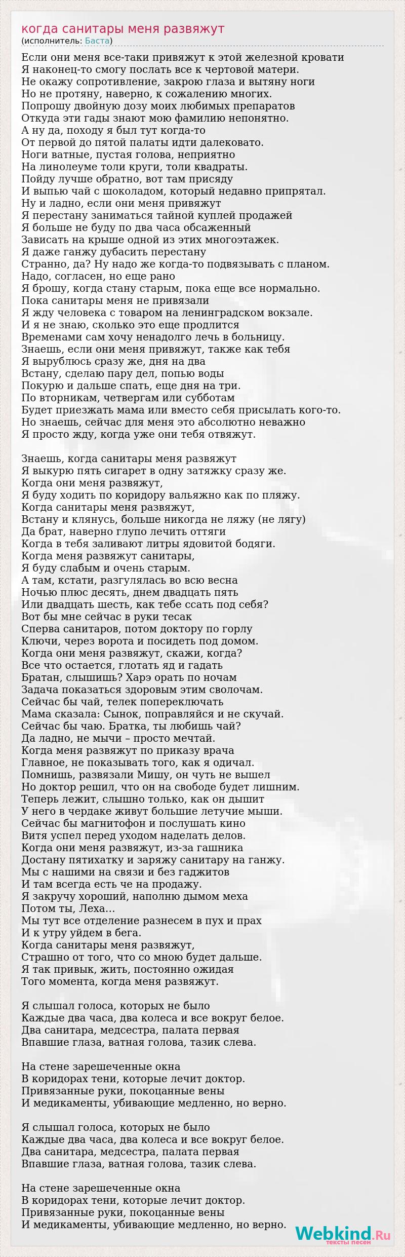 Если они меня все-таки привяжут к этой железной кровати Я наконец-то смогу послать все к чертовой матери. Не окажу сопротивление, закрою глаза и вытяну ноги Но не протяну, наверно, к сожалению многих. Попрошу двойную дозу моих любимых препаратов Откуда эти гады знают мою фамилию непонятно. А ну да, походу я был тут когда-то От первой до пятой палаты идти далековато. Ноги ватные, пустая голова, неприятно На линолеуме толи круги, толи квадраты. Пойду лучше обратно, вот там присяду И выпью чай с шоколадом, который недавно припрятал. Ну и ладно, если они меня привяжут Я перестану заниматься тайной куплей продажей Я больше не буду по два часа обсаженный Зависать на крыше одной из этих многоэтажек. Я даже ганжу дубасить перестану Странно, да? Ну надо же когда-то подвязывать с планом. Надо, согласен, но еще рано Я брошу, когда стану старым, пока еще все нормально. Пока санитары меня не привязали Я жду человека с товаром на ленинградском вокзале. И я не знаю, сколько это еще продлится Временами сам хочу ненадолго лечь в больницу. Знаешь, если они меня привяжут, также как тебя Я вырублюсь сразу же, дня на два Встану, сделаю пару дел, попью воды Покурю и дальше спать, еще дня на три. По вторникам, четвергам или субботам Будет приезжать мама или вместо себя присылать кого-то. Но знаешь, сейчас для меня это абсолютно неважно Я просто жду, когда уже они тебя отвяжут. Знаешь, когда санитары меня развяжут Я выкурю пять сигарет в одну затяжку сразу же. Когда они меня развяжут, Я буду ходить по коридору вальяжно как по пляжу. Когда санитары меня развяжут, Встану и клянусь, больше никогда не ляжу (не лягу) Да брат, наверно глупо лечить оттяги Когда в тебя заливают литры ядовитой бодяги. Когда меня развяжут санитары, Я буду слабым и очень старым. А там, кстати, разгулялась во всю весна Ночью плюс десять, днем двадцать пять Или двадцать шесть, как тебе ссать под себя? Вот бы мне сейчас в руки тесак Сперва санитаров, потом доктору по горлу Ключи, через ворота и посидеть под домом. Когда они меня развяжут, скажи, когда? Все что остается, глотать яд и гадать Братан, слышишь? Харэ орать по ночам Задача показаться здоровым этим сволочам. Сейчас бы чай, телек попереключать Мама сказала: Сынок, поправляйся и не скучай. Сейчас бы чаю. Братка, ты любишь чай? Да ладно, не мычи – просто мечтай. Когда меня развяжут по приказу врача Главное, не показывать того, как я одичал. Помнишь, развязали Мишу, он чуть не вышел Но доктор решил, что он на свободе будет лишним. Теперь лежит, слышно только, как он дышит У него в чердаке живут большие летучие мыши. Сейчас бы магнитофон и послушать кино Витя успел перед уходом наделать делов. Когда они меня развяжут, из-за гашника Достану пятихатку и заряжу санитару на ганжу. Мы с нашими на связи и без гаджитов И там всегда есть че на продажу. Я закручу хороший, наполню дымом меха Потом ты, Леха… Мы тут все отделение разнесем в пух и прах И к утру уйдем в бега. Когда санитары меня развяжут, Страшно от того, что со мною будет дальше. Я так привык, жить, постоянно ожидая Того момента, когда меня развяжут. Я слышал голоса, которых не было Каждые два часа, два колеса и все вокруг белое. Два санитара, медсестра, палата первая Впавшие глаза, ватная голова, тазик слева. На стене зарешеченные окна В коридорах тени, которые лечит доктор. Привязанные руки, покоцанные вены И медикаме