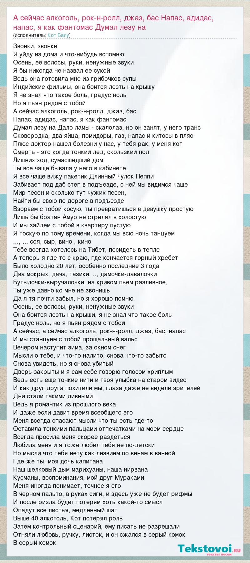 Звонки, звонки Я уйду из дома и что-нибудь вспомню Осень, ее волосы, руки, ненужные звуки Я бы никогда не назвал ее сукой Ведь она готовила мне из грибочков супы Индийские фильмы, она боится лезть на крышу Я не знал что такое боль, градус ноль Но я пьян рядом с тобой А сейчас алкоголь, рок-н-ролл, джаз, бас Напас, адидас, напас, я как фантомас Думал лезу на Дало ламы - скалолаз, но он занят, у него транс Сковородка, два яйца, помидоры, газ, напас и китосы в пляс Плюс доктор нашел болезни у нас, у тебя рак, у меня кот Смерть - это когда тонкий лед, скользкий пол Лишних ход, сумасшедший дом Ты все чаще бывала у него в кабинете, Я все чаще вижу пакетик Длинный чулок Пеппи Забивает под даб степ в подъезде, с ней мы видимся чаще Мир тесен и сколько тут чужих песен, Найти бы свою по дороге в подъезде Взорвем с тобой косую, ты превратишься в девушку простую Лишь бы братан Амур не стрелял в холостую И мы зайдем с тобой в квартиру пустую Я тоскую по тому времени, когда мы всю ночь танцуем ..., ... соя, сыр, вино , кино Тебе всегда хотелось на Тибет, посидеть в тепле А теперь я где-то с краю, где кончается горный хребет Было холодно 20 лет, особенно последние 3 года Два мокрых, дача, тазики, .., дамочки-давалочки Бутылочки-выручалочки, на кривом пьем разливное, Ты уже давно ко мне не звонишь Да я тя почти забыл, но я хорошо помню Осень, ее волосы, руки, ненужные звуки Она боится лезть на крыши, я не знал что такое боль Градус ноль, но я пьян рядом с тобой А сейчас, а сейчас алкоголь, рок-н-ролл, джаз, бас, напас И мы станцуем с тобой прощальный вальс Вечером наступит зима, за окном снег Мысли о тебе, и что-то налито, снова что-то забыто Снова увидеть, но я снова убитый Дверь закрыты и я сам себе говорю голосом хриплым Ведь есть еще тонкие нити и твоя улыбка на старом видео И как друг друга похитили мы, глаза даже не видели зрителей Дни стали такими дивными Ведь я романтик из прошлого века И даже если давит время всеобщего эго Меня всегда спасают мысли что ты есть где-то Оставила тонкими пальцами отпечатками на моем сердце Всегда просила меня скорее раздеться Любила меня и я тоже любил тебя не по-детски Но мысли что тебя нету как лезвием по венам в ванной Где же ты, моя дочь капитана Наш шелковый дым марихуаны, наша нирвана Кусманы, воспоминания, мой друг Мураками Меня иногда понимает, точнее я его В черном пальто, в руках сиги, и здесь уже не будет рифмы И после ризла будет потерям хоть какой-то смысл Опадут все листья, медленный шаг Выше 40 алкоголь, Кот потерял роль Затем контрольный сценарий, ему писать не разрешали Отняли любовь, ручку, листок, и он сжался в серый комок В серый комок