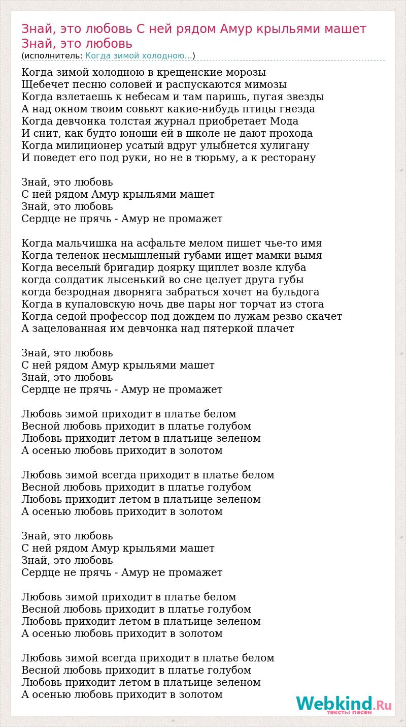 Когда зимой холодною в крещенские морозы Щебечет песню соловей и распускаются мимозы Когда взлетаешь к небесам и там паришь, пугая звезды А над окном твоим совьют какие-нибудь птицы гнезда Когда девчонка толстая журнал приобретает Мода И снит, как будто юноши ей в школе не дают прохода Когда милиционер усатый вдруг улыбнется хулигану И поведет его под руки, но не в тюрьму, а к ресторану Знай, это любовь С ней рядом Амур крыльями машет Знай, это любовь Сердце не прячь - Амур не промажет Когда мальчишка на асфальте мелом пишет чье-то имя Когда теленок несмышленый губами ищет мамки вымя Когда веселый бригадир доярку щиплет возле клуба когда солдатик лысенький во сне целует друга губы когда безродная дворняга забраться хочет на бульдога Когда в купаловскую ночь две пары ног торчат из стога Когда седой профессор под дождем по лужам резво скачет А зацелованная им девчонка над пятеркой плачет Знай, это любовь С ней рядом Амур крыльями машет Знай, это любовь Сердце не прячь - Амур не промажет Любовь зимой приходит в платье белом Весной любовь приходит в платье голубом Любовь приходит летом в платьице зеленом А осенью любовь приходит в золотом Любовь зимой всегда приходит в платье белом Весной любовь приходит в платье голубом Любовь приходит летом в платьице зеленом А осенью любовь приходит в золотом Знай, это любовь С ней рядом Амур крыльями машет Знай, это любовь Сердце не прячь - Амур не промажет Любовь зимой приходит в платье белом Весной любовь приходит в платье голубом Любовь приходит летом в платьице зеленом А осенью любовь приходит в золотом Любовь зимой всегда приходит в платье белом Весной любовь приходит в платье голубом Любовь приходит летом в платьице зеленом А осенью любовь приходит в золотом