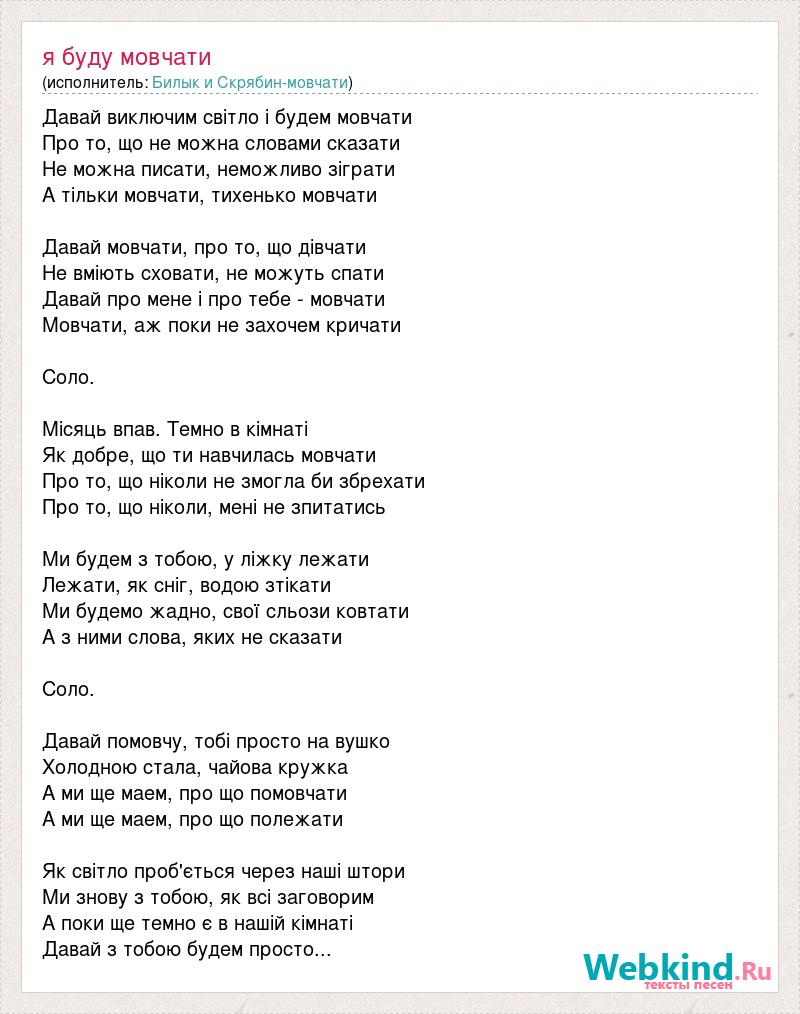 Давай виключим світло і будем мовчати Про то, що не можна словами сказати Не можна писати, неможливо зіграти А тільки мовчати, тихенько мовчати Давай мовчати, про то, що дівчати Не вміють сховати, не можуть спати Давай про мене і про тебе - мовчати Мовчати, аж поки не захочем кричати Соло. Місяць впав. Темно в кімнаті Як добре, що ти навчилась мовчати Про то, що ніколи не змогла би збрехати Про то, що ніколи, мені не зпитатись Ми будем з тобою, у ліжку лежати Лежати, як сніг, водою зтікати Ми будемо жадно, свої сльози ковтати А з ними слова, яких не сказати Соло. Давай помовчу, тобі просто на вушко Холодною стала, чайова кружка А ми ще маем, про що помовчати А ми ще маем, про що полежати Як світло проб'ється через наші штори Ми знову з тобою, як всі заговорим А поки ще темно є в нашій кімнаті Давай з тобою будем просто...