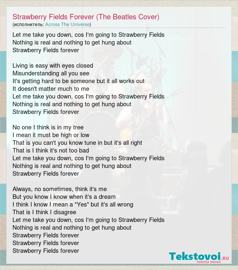 Let me take you down, cos I'm going to Strawberry Fields Nothing is real and nothing to get hung about Strawberry Fields forever Living is easy with eyes closed Misunderstanding all you see It's getting hard to be someone but it all works out It doesn't matter much to me Let me take you down, cos I'm going to Strawberry Fields Nothing is real and nothing to get hung about Strawberry Fields forever No one I think is in my tree I mean it must be high or low That is you can't you know tune in but it's all right That is I think it's not too bad Let me take you down, cos I'm going to Strawberry Fields Nothing is real and nothing to get hung about Strawberry Fields forever Always, no sometimes, think it's me But you know I know when it's a dream I think I know I mean a "Yes" but it's all wrong That is I think I disagree Let me take you down, cos I'm going to Strawberry Fields Nothing is real and nothing to get hung about Strawberry Fields forever Strawberry Fields forever Strawberry Fields forever
