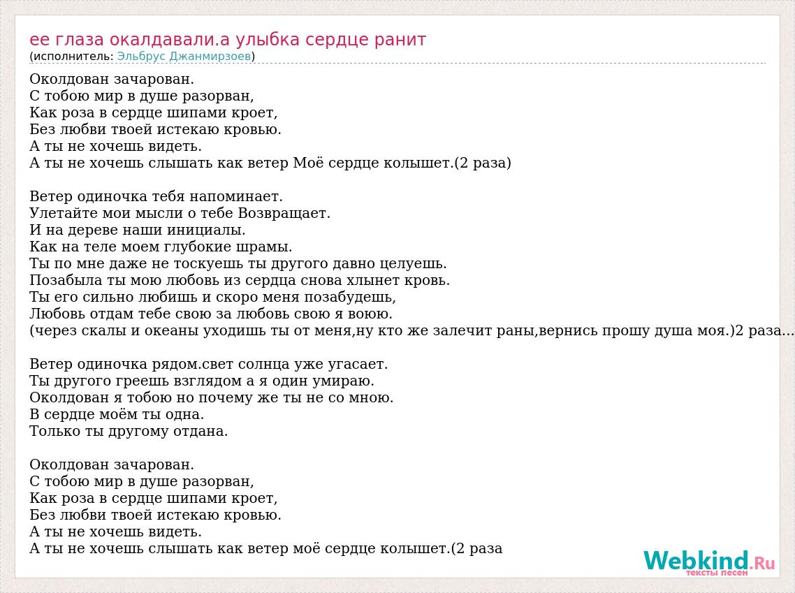 Околдован зачарован. С тобою мир в душе разорван, Как роза в сердце шипами кроет, Без любви твоей истекаю кровью. А ты не хочешь видеть. А ты не хочешь слышать как ветер Моё сердце колышет.(2 раза) Ветер одиночка тебя напоминает. Улетайте мои мысли о тебе Возвращает. И на дереве наши инициалы. Как на теле моем глубокие шрамы. Ты по мне даже не тоскуешь ты другого давно целуешь. Позабыла ты мою любовь из сердца снова хлынет кровь. Ты его сильно любишь и скоро меня позабудешь, Любовь отдам тебе свою за любовь свою я воюю. (через скалы и океаны уходишь ты от меня,ну кто же залечит раны,вернись прошу душа моя.)2 раза... Ветер одиночка рядом.свет солнца уже угасает. Ты другого греешь взглядом а я один умираю. Околдован я тобою но почему же ты не со мною. В сердце моём ты одна. Только ты другому отдана. Околдован зачарован. С тобою мир в душе разорван, Как роза в сердце шипами кроет, Без любви твоей истекаю кровью. А ты не хочешь видеть. А ты не хочешь слышать как ветер моё сердце колышет.(2 раза