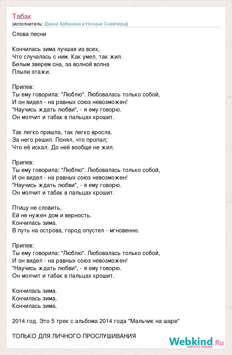 Слова песни Кончилась зима лучшая из всех, Что случалась с ним. Как умел, так жил. Белым зверем сна, за волной волна Плыли этажи. Припев: Ты ему говорила: "Люблю". Любовалась только собой, И он видел - на равных союз невозможен! "Научись ждать любви", - я ему говорю. Он молчит и табак в пальцах крошит. Так легко пришла, так легко вросла. За него решил. Понял, что пропал; Что её искал. До неё вообще не жил. Припев: Ты ему говорила: "Люблю". Любовалась только собой, И он видел - на равных союз невозможен! "Научись ждать любви", - я ему говорю. Он молчит и табак в пальцах крошит. Птицу не словить, Ей не нужен дом и верность. Кончилась зима. В путь на острова, город опустел - мгновенно. Припев: Ты ему говорила: "Люблю". Любовалась только собой, И он видел - на равных союз невозможен! "Научись ждать любви", - я ему говорю. Он молчит и табак в пальцах крошит. Кончилась зима. Кончилась зима. Кончилась зима. 2014 год. Это 5 трек с альбома 2014 года "Мальчик на шаре" ТОЛЬКО ДЛЯ ЛИЧНОГО ПРОСЛУШИВАНИЯ