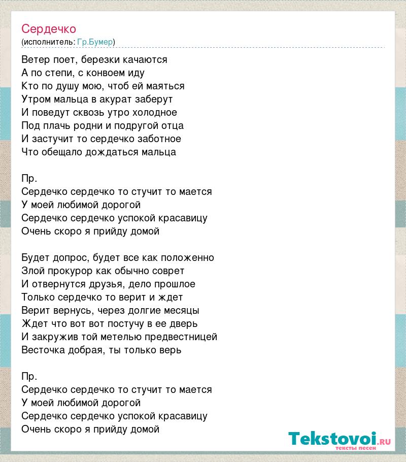 Ветер поет, березки качаются А по степи, с конвоем иду Кто по душу мою, чтоб ей маяться Утром мальца в акурат заберут И поведут сквозь утро холодное Под плачь родни и подругой отца И застучит то сердечко заботное Что обещало дождаться мальца Пр. Сердечко сердечко то стучит то мается У моей любимой дорогой Сердечко сердечко успокой красавицу Очень скоро я прийду домой Будет допрос, будет все как положенно Злой прокурор как обычно соврет И отвернутся друзья, дело прошлое Только сердечко то верит и ждет Верит вернусь, через долгие месяцы Ждет что вот вот постучу в ее дверь И закружив той метелью предвестницей Весточка добрая, ты только верь Пр. Сердечко сердечко то стучит то мается У моей любимой дорогой Сердечко сердечко успокой красавицу Очень скоро я прийду домой
