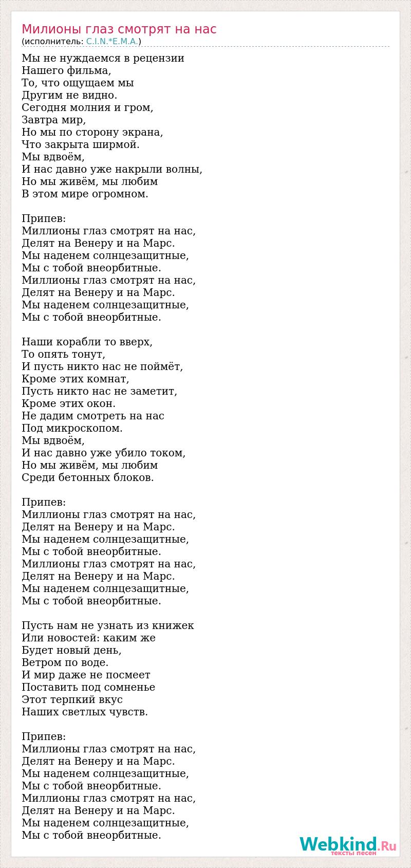 Мы не нуждаемся в рецензии Нашего фильма, То, что ощущаем мы Другим не видно. Сегодня молния и гром, Завтра мир, Но мы по сторону экрана, Что закрыта ширмой. Мы вдвоём, И нас давно уже накрыли волны, Но мы живём, мы любим В этом мире огромном. Припев: Миллионы глаз смотрят на нас, Делят на Венеру и на Марс. Мы наденем солнцезащитные, Мы с тобой внеорбитные. Миллионы глаз смотрят на нас, Делят на Венеру и на Марс. Мы наденем солнцезащитные, Мы с тобой внеорбитные. Наши корабли то вверх, То опять тонут, И пусть никто нас не поймёт, Кроме этих комнат, Пусть никто нас не заметит, Кроме этих окон. Не дадим смотреть на нас Под микроскопом. Мы вдвоём, И нас давно уже убило током, Но мы живём, мы любим Среди бетонных блоков. Припев: Миллионы глаз смотрят на нас, Делят на Венеру и на Марс. Мы наденем солнцезащитные, Мы с тобой внеорбитные. Миллионы глаз смотрят на нас, Делят на Венеру и на Марс. Мы наденем солнцезащитные, Мы с тобой внеорбитные. Пусть нам не узнать из книжек Или новостей: каким же Будет новый день, Ветром по воде. И мир даже не посмеет Поставить под сомненье Этот терпкий вкус Наших светлых чувств. Припев: Миллионы глаз смотрят на нас, Делят на Венеру и на Марс. Мы наденем солнцезащитные, Мы с тобой внеорбитные. Миллионы глаз смотрят на нас, Делят на Венеру и на Марс. Мы наденем солнцезащитные, Мы с тобой внеорбитные.