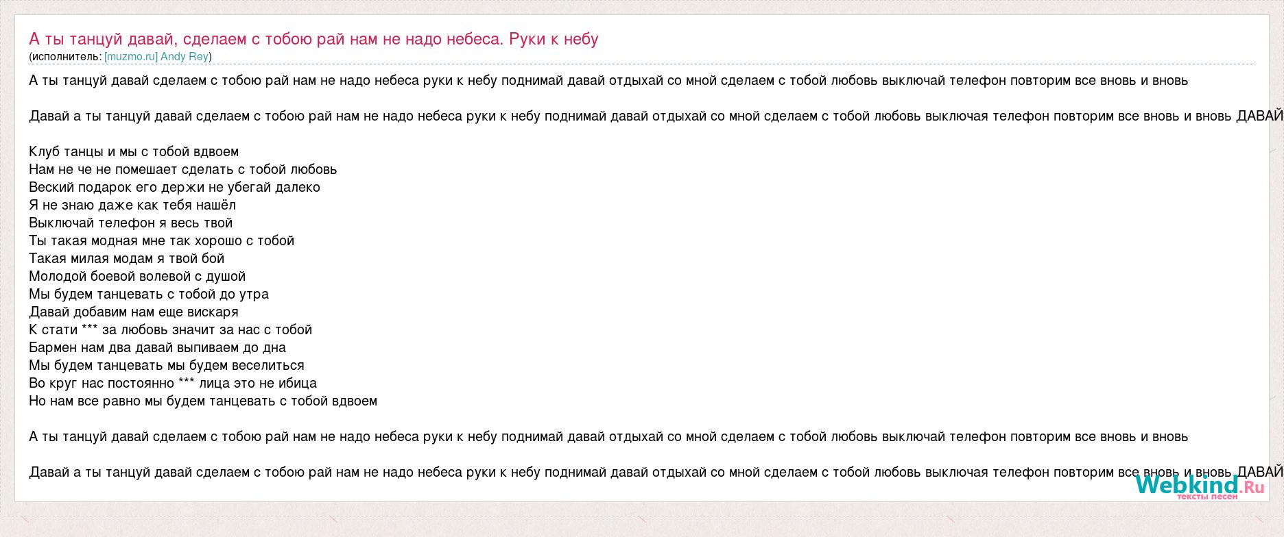 А ты танцуй давай сделаем с тобою рай нам не надо небеса руки к небу поднимай давай отдыхай со мной сделаем с тобой любовь выключай телефон повторим все вновь и вновь Давай а ты танцуй давай сделаем с тобою рай нам не надо небеса руки к небу поднимай давай отдыхай со мной сделаем с тобой любовь выключая телефон повторим все вновь и вновь ДАВАЙ Клуб танцы и мы с тобой вдвоем Нам не че не помешает сделать с тобой любовь Веский подарок его держи не убегай далеко Я не знаю даже как тебя нашёл Выключай телефон я весь твой Ты такая модная мне так хорошо с тобой Такая милая модам я твой бой Молодой боевой волевой с душой Мы будем танцевать с тобой до утра Давай добавим нам еще вискаря К стати *** за любовь значит за нас с тобой Бармен нам два давай выпиваем до дна Мы будем танцевать мы будем веселиться Во круг нас постоянно *** лица это не ибица Но нам все равно мы будем танцевать с тобой вдвоем А ты танцуй давай сделаем с тобою рай нам не надо небеса руки к небу поднимай давай отдыхай со мной сделаем с тобой любовь выключай телефон повторим все вновь и вновь Давай а ты танцуй давай сделаем с тобою рай нам не надо небеса руки к небу поднимай давай отдыхай со мной сделаем с тобой любовь выключая телефон повторим все вновь и вновь ДАВАЙ