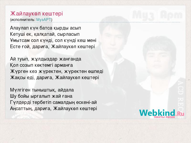 В 2001 году в апреле месяце образовалась группа «МузАРТ». В составе группы основными солистами являются Мейрамбек Бесбаев, Сакен Майгазиев и Кенжебек Жанабилов.Оценив возможности, друг друга, ребята решили объединиться и создать эстрадную группу.В Казахстане сегодня много групп, но это трио сумело найти свое неповторимое лицо: в репертуаре группы есть и эстрадные и... подробнее