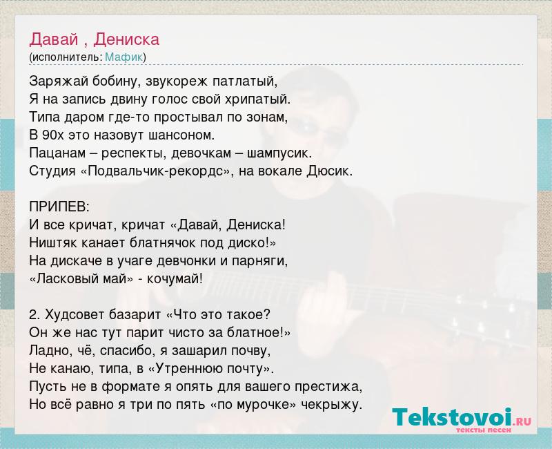 Заряжай бобину, звукореж патлатый, Я на запись двину голос свой хрипатый. Типа даром где-то простывал по зонам, В 90х это назовут шансоном. Пацанам – респекты, девочкам – шампусик. Студия «Подвальчик-рекордс», на вокале Дюсик. ПРИПЕВ: И все кричат, кричат «Давай, Дениска! Ништяк канает блатнячок под диско!» На дискаче в учаге девчонки и парняги, «Ласковый май» - кочумай! 2. Худсовет базарит «Что это такое? Он же нас тут парит чисто за блатное!» Ладно, чё, спасибо, я зашарил почву, Не канаю, типа, в «Утреннюю почту». Пусть не в формате я опять для вашего престижа, Но всё равно я три по пять «по мурочке» чекрыжу.