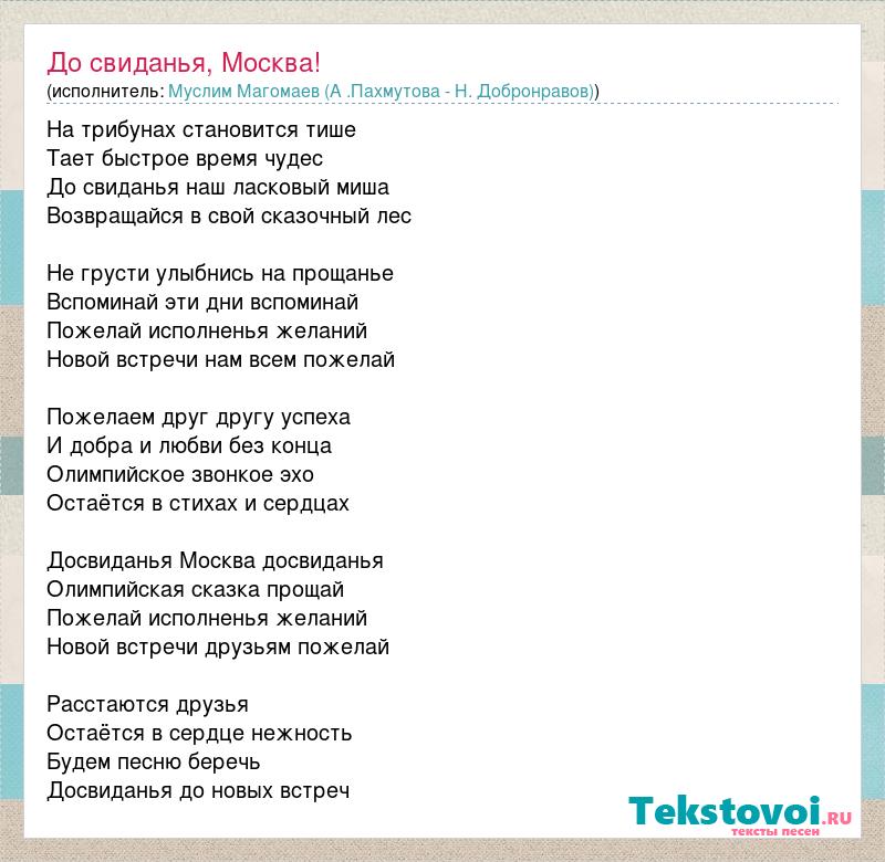 На трибунах становится тише Тает быстрое время чудес До свиданья наш ласковый миша Возвращайся в свой сказочный лес Не грусти улыбнись на прощанье Вспоминай эти дни вспоминай Пожелай исполненья желаний Новой встречи нам всем пожелай Пожелаем друг другу успеха И добра и любви без конца Олимпийское звонкое эхо Остаётся в стихах и сердцах Досвиданья Москва досвиданья Олимпийская сказка прощай Пожелай исполненья желаний Новой встречи друзьям пожелай Расстаются друзья Остаётся в сердце нежность Будем песню беречь Досвиданья до новых встреч